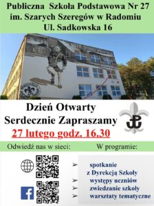 Serdecznie zapraszamy przyszłych uczniów klas pierwszych wraz z Rodzicami na Dzień Otwarty w Publicznej Szkole Podstawowej nr 27 im. Szarych Szeregów w Radomiu.