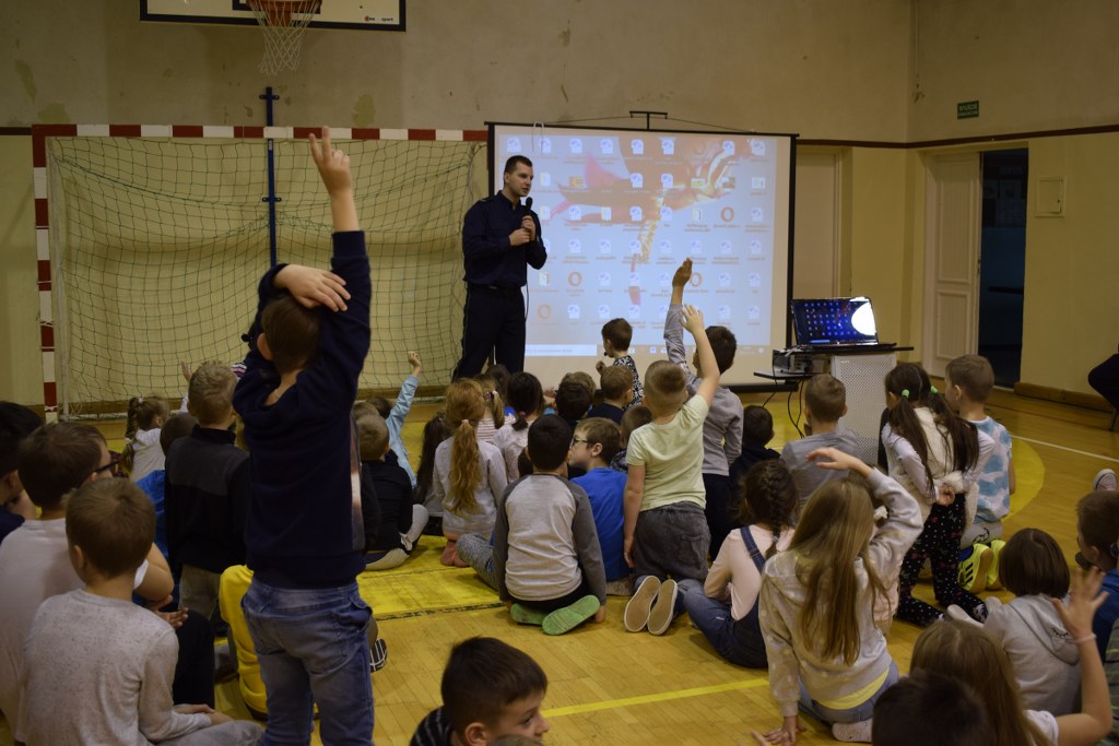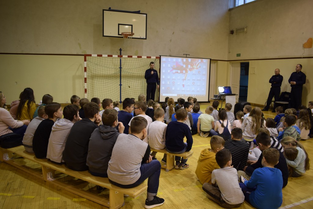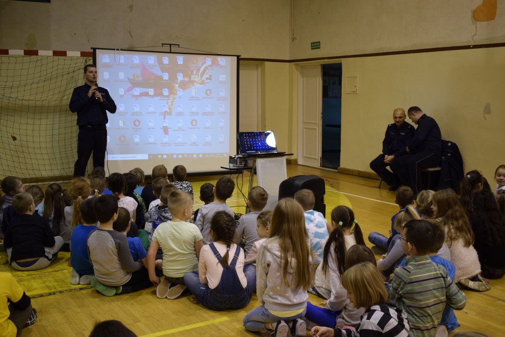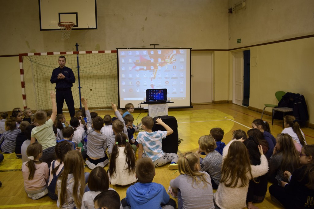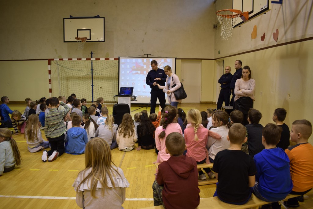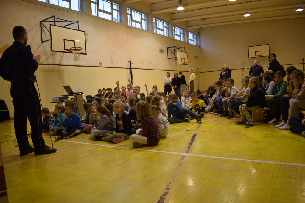 13 grudnia 2019 roku odwiedzili nas policjanci, którzy podczas prelekcji na sali gimnastycznej opowiedzieli nam, jak należy się zachowywać, aby być bezpiecznym w domu i poza nim.