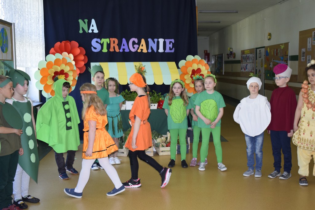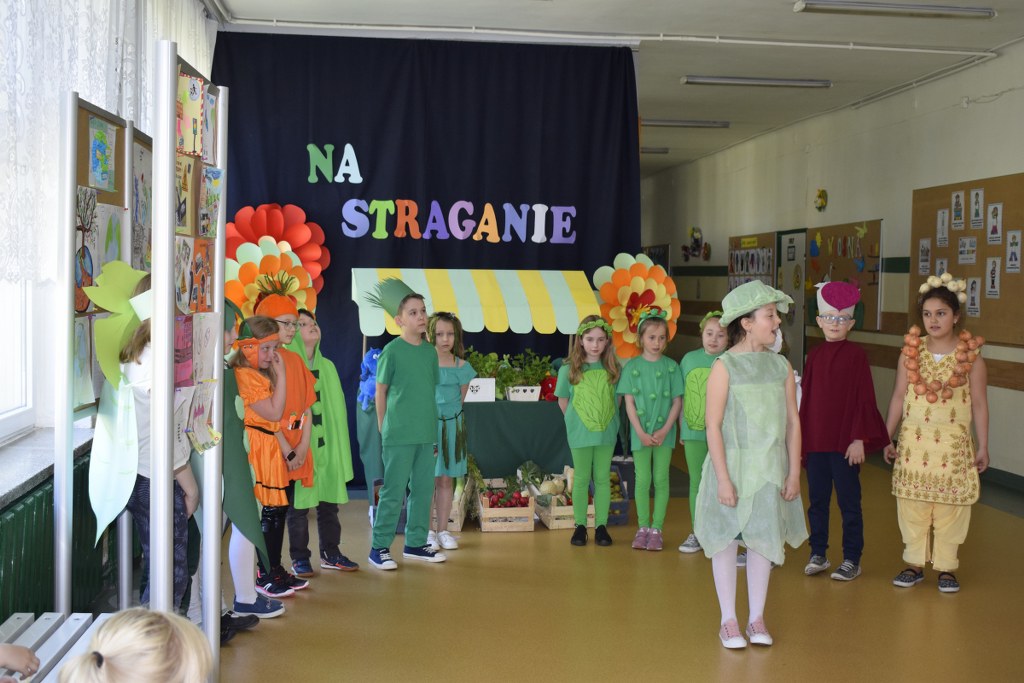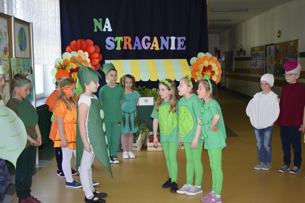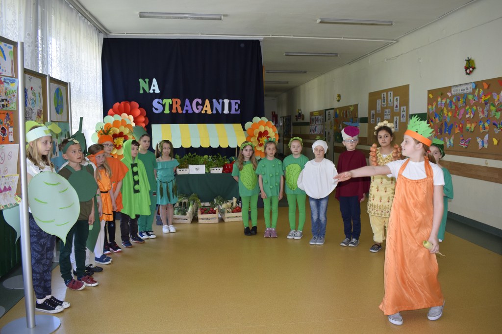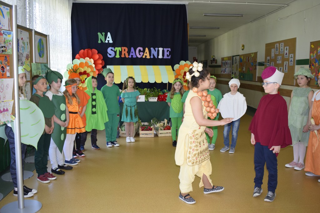 Szkolne koło teatralne pod kierunkiem Pani Mileny Tęczy – Bilskiej przygotowało przedstawienie na podstawie wiersza Jana Brzechwy pt. „Na starganie”. Aktorzy mieli piękne stroje, które bezbłędnie wskazywały na graną postać. Dekoracja również przenosiła nas wprost na gwarny bazar, na którym przekupki zachwalają swój towar. Uczniowie z talentem odegrali swoje role, za co zostali nagrodzeni wielkimi brawami.