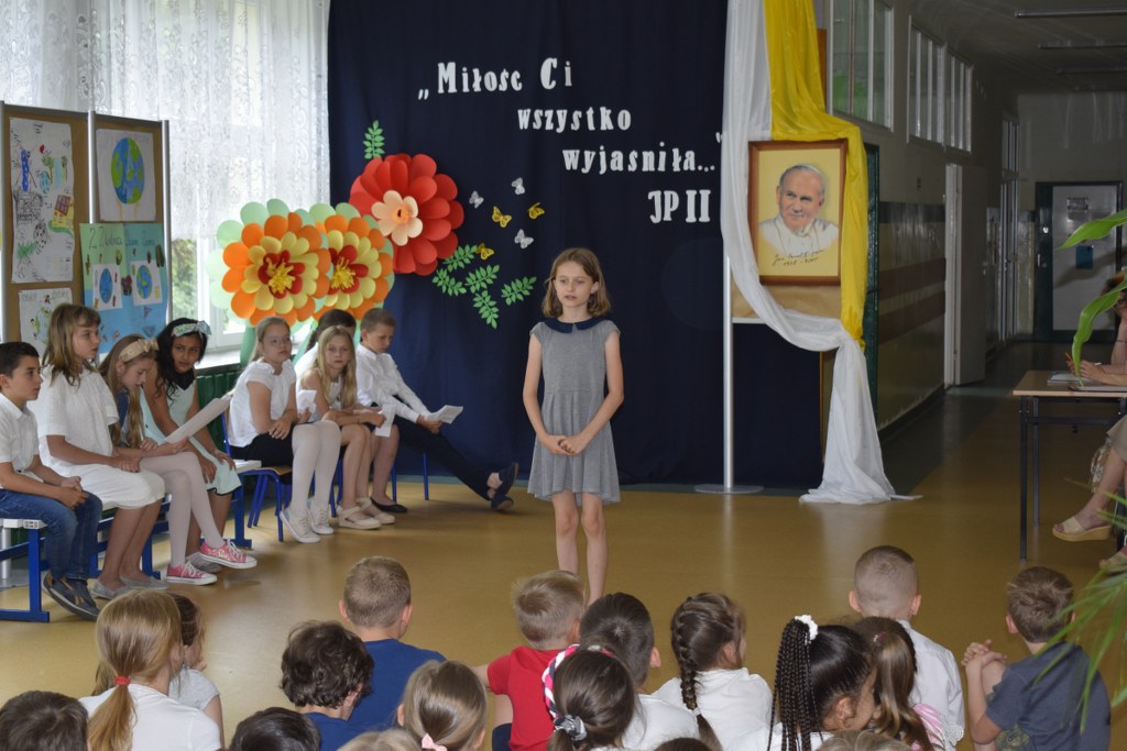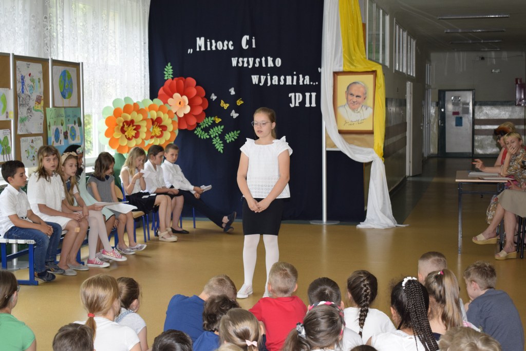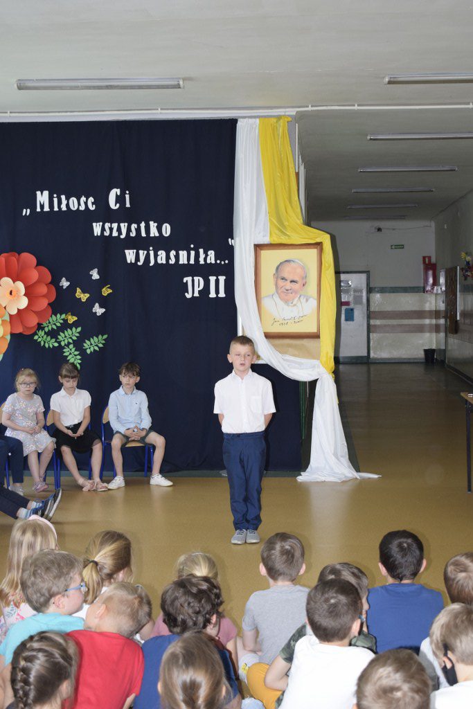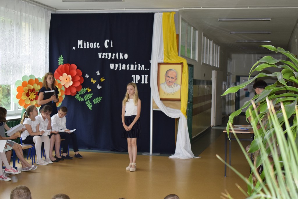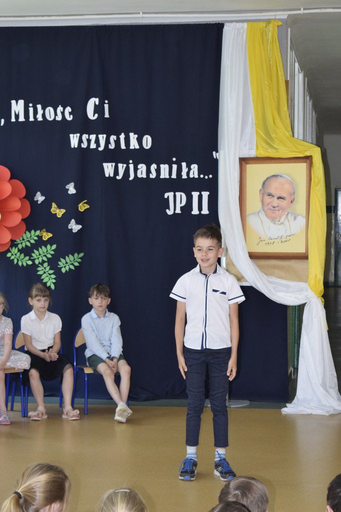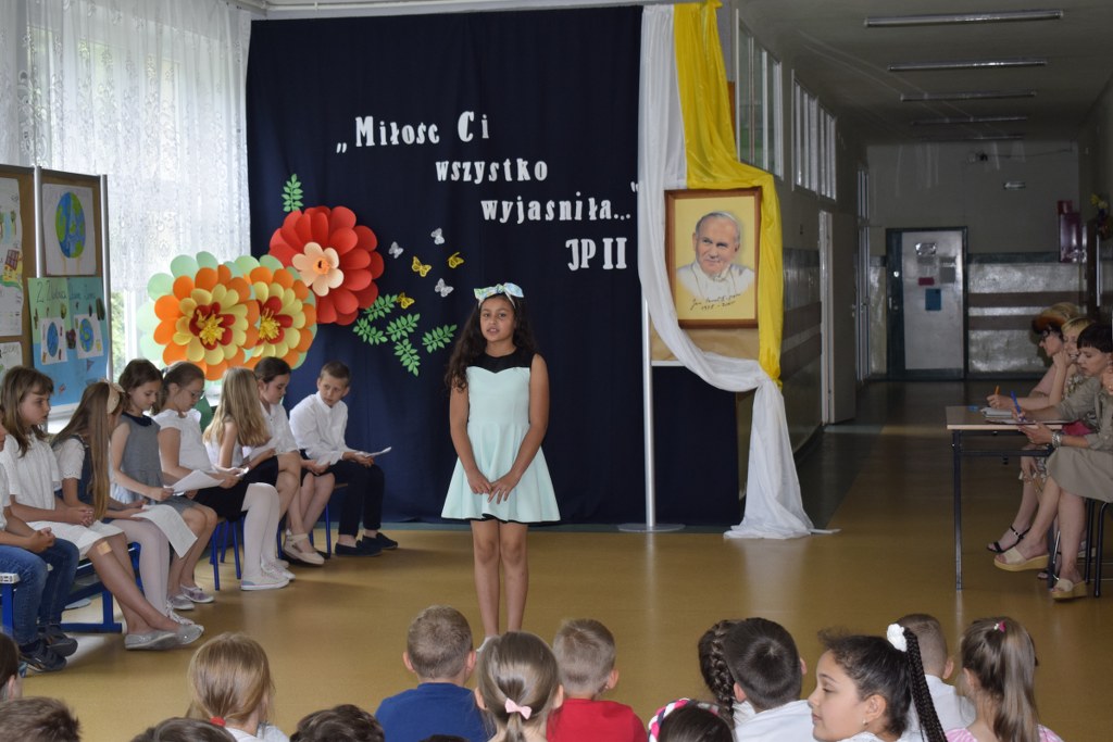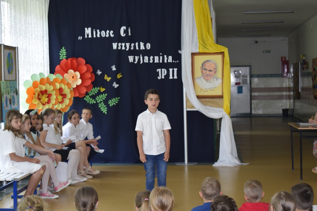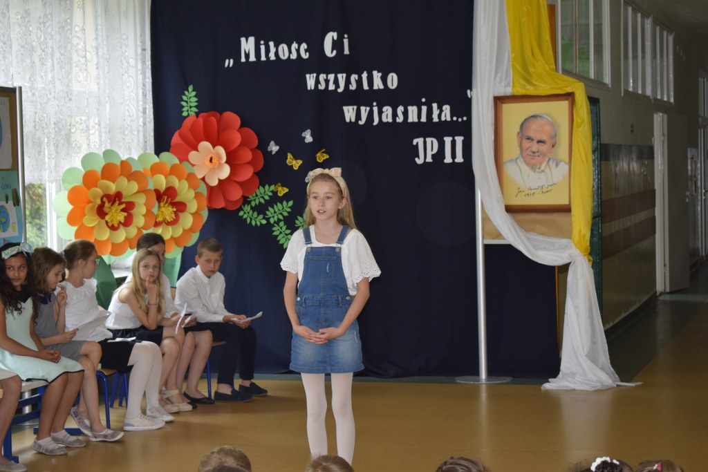 W uroczysty sposób zakończyliśmy obchody 100-ej rocznicy urodzin Świętego Jana Pawła II. 16 czerwca w naszej szkole odbył się konkurs poezji Jana Pawła II. Uczniowie klas 3a, 3b, 4a interpretowali wiersze naszego Wielkiego Rodaka.