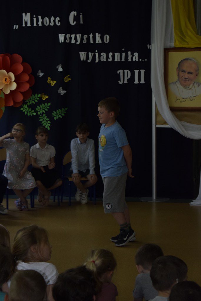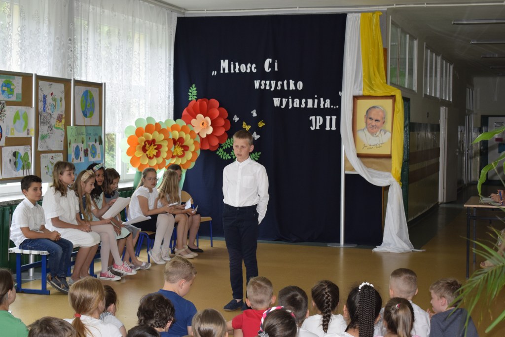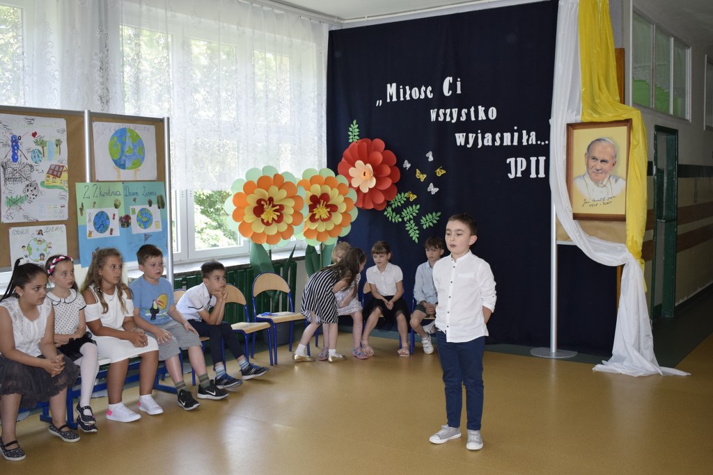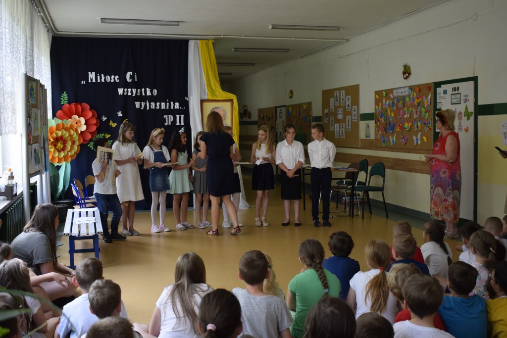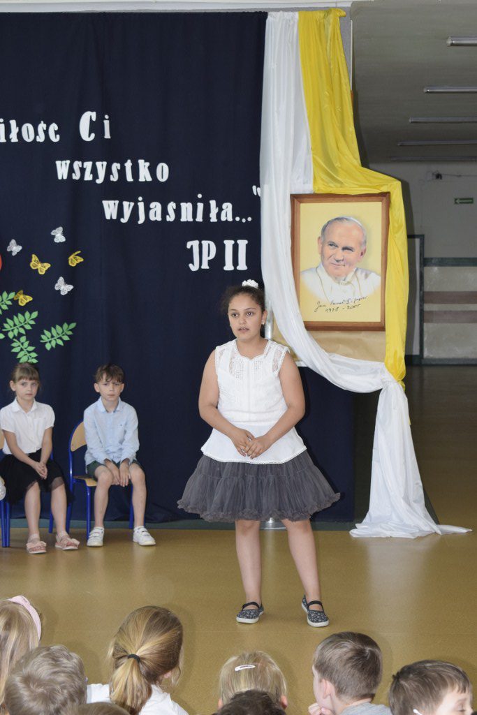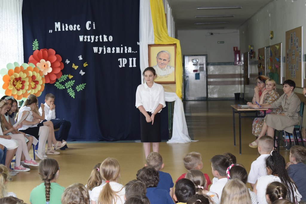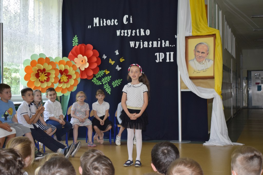 W uroczysty sposób zakończyliśmy obchody 100-ej rocznicy urodzin Świętego Jana Pawła II. 16 czerwca w naszej szkole odbył się konkurs poezji Jana Pawła II. Uczniowie klas 3a, 3b, 4a interpretowali wiersze naszego Wielkiego Rodaka.