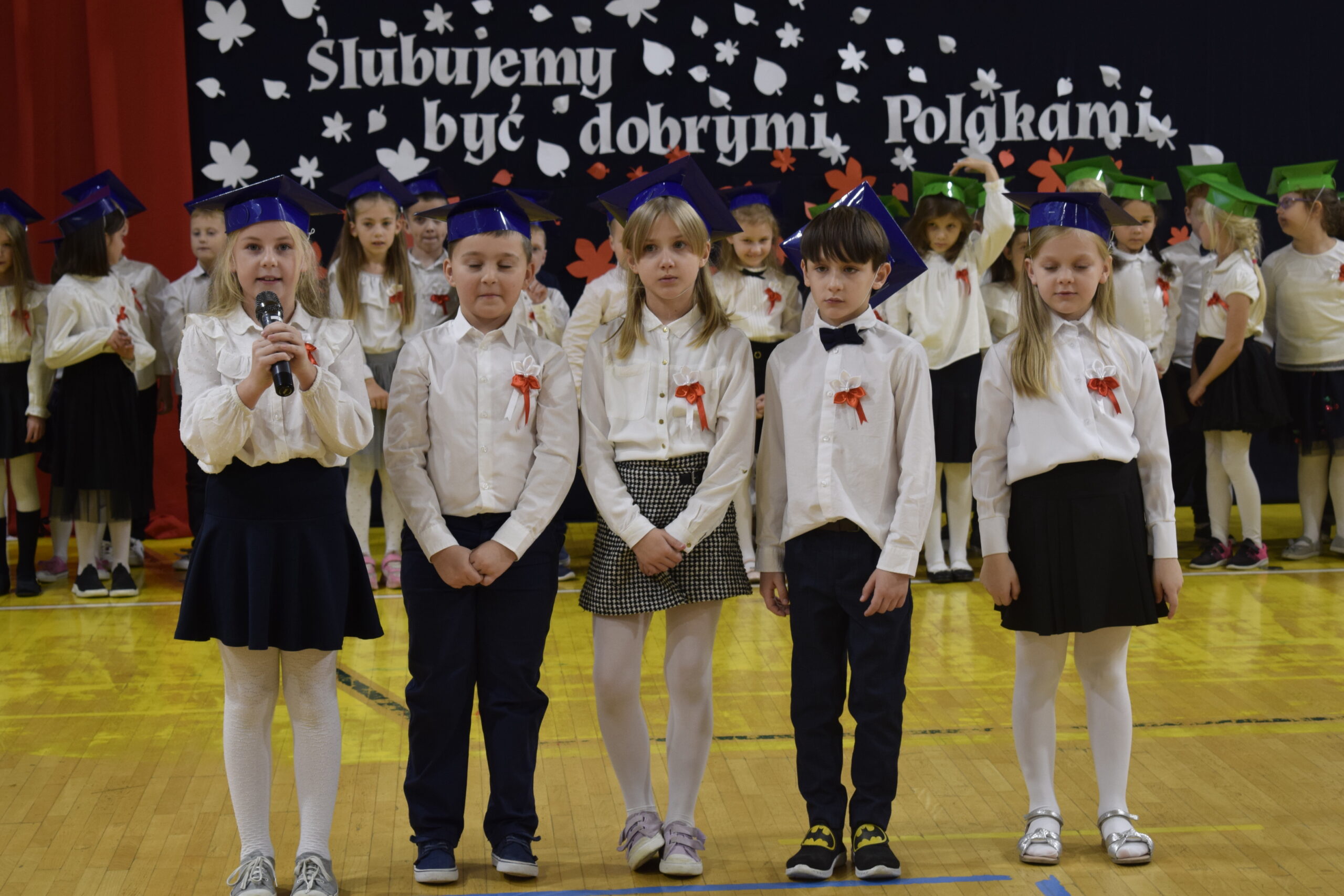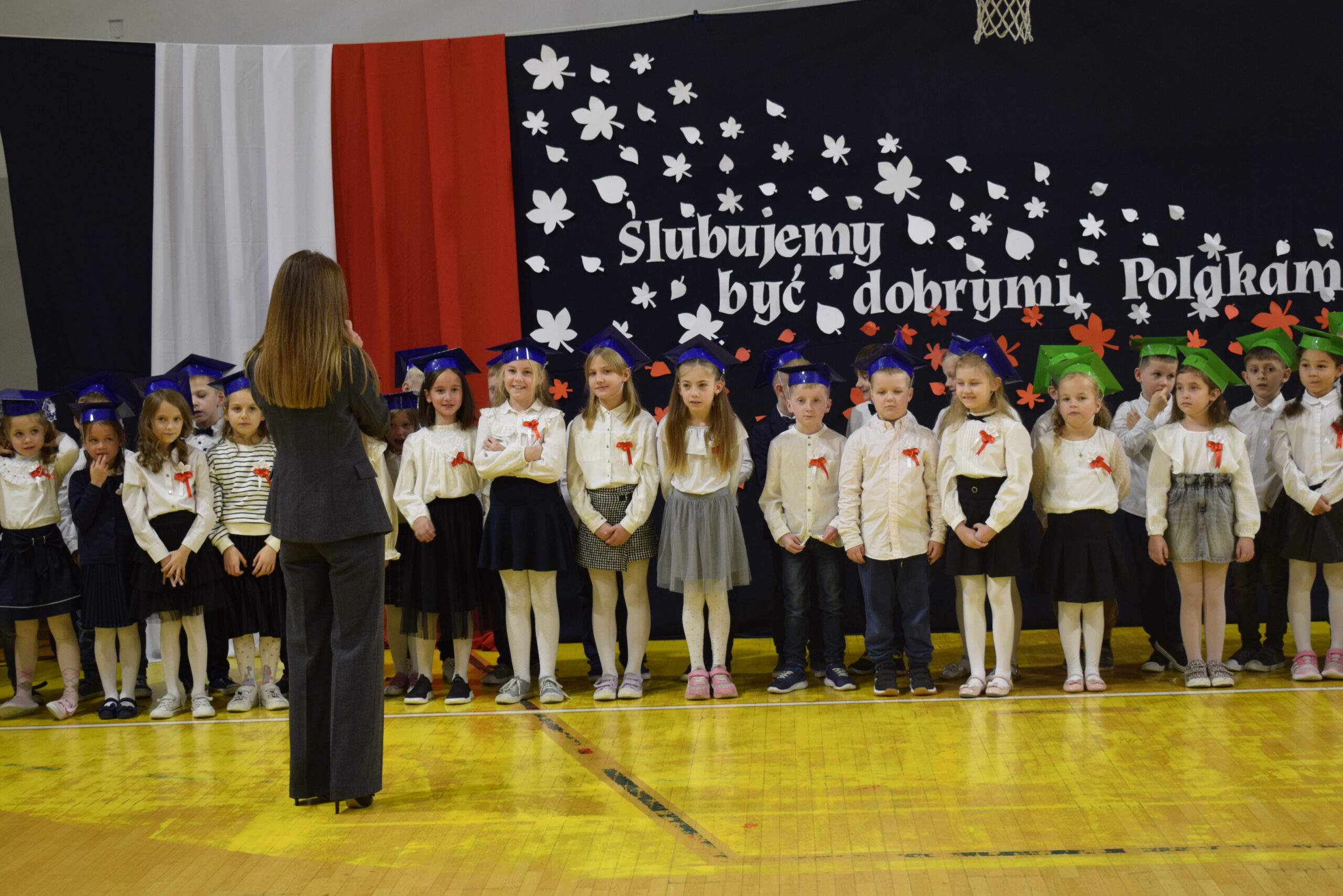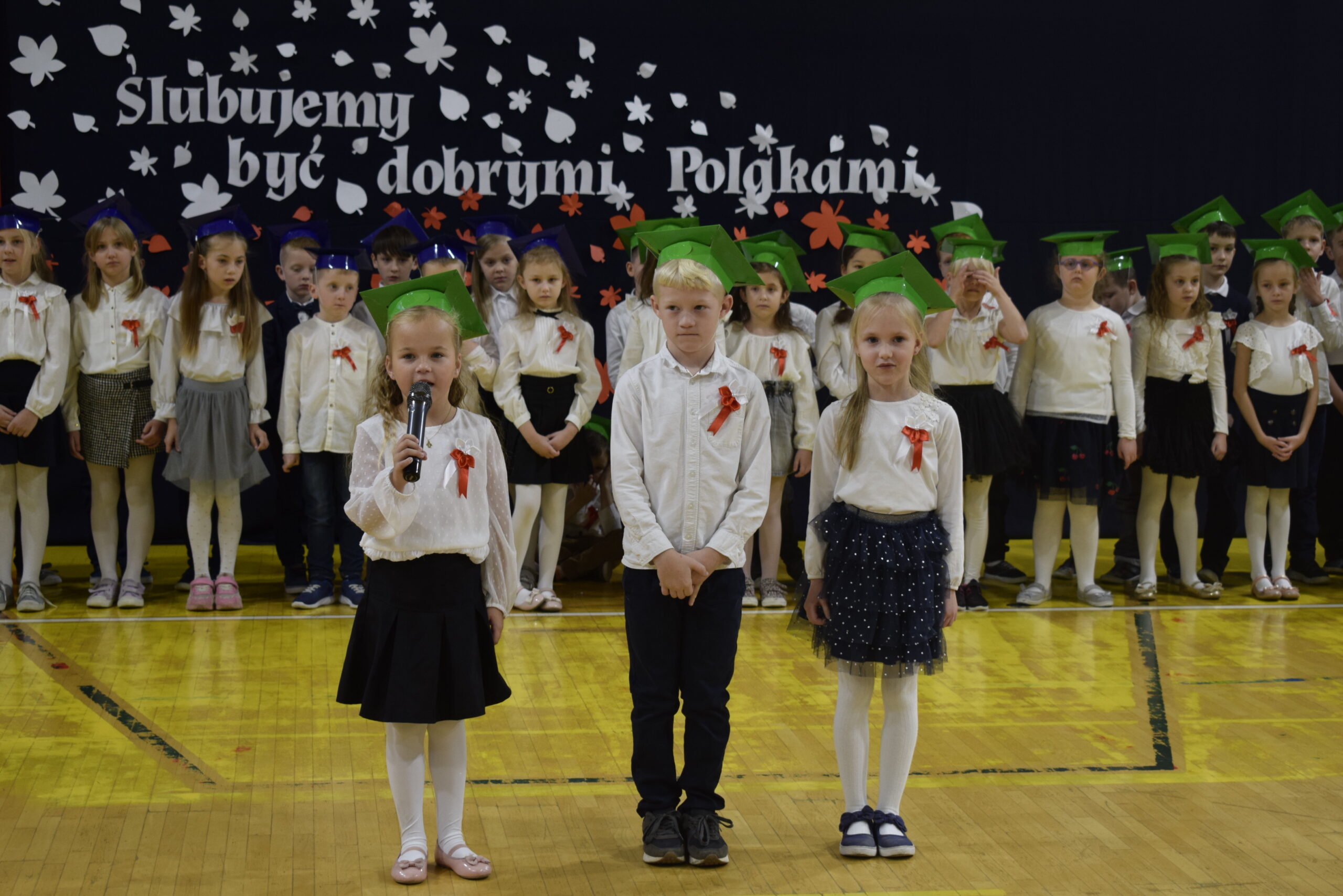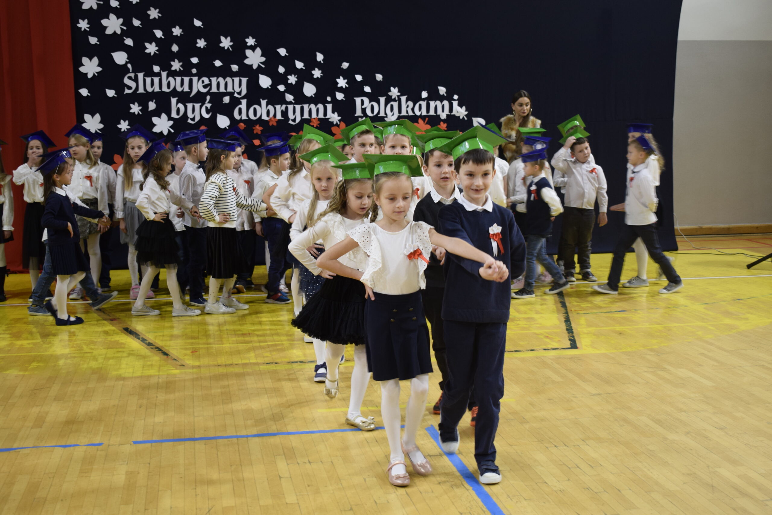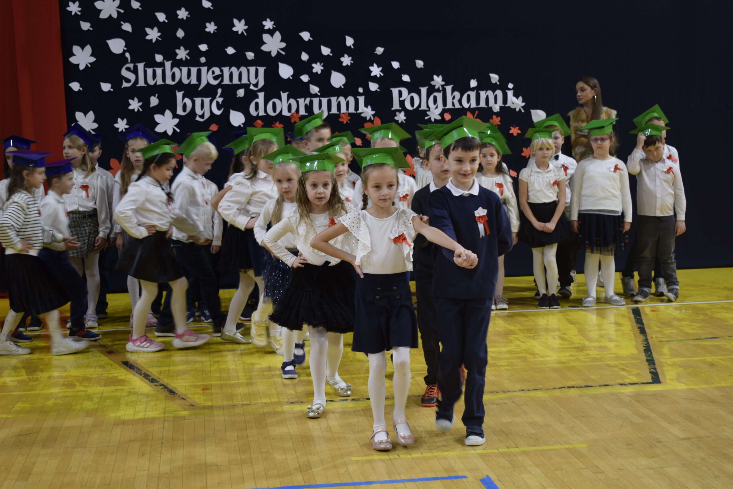 Bohaterowie uroczystości, ubrani w kolorowe birety na początku odtańczyli tradycyjnego poloneza, a następnie przedstawili program artystyczny, w którym zaprezentowali swoje umiejętności recytatorskie i wokalne. Na koniec dzieci wypowiedziały słowa przysięgi, wyrażając gotowość do bycia odpowiedzialnym uczniem, dbania o dobre imię szkoły oraz respektowania jej tradycji. Po uroczystym ślubowaniu, każdy z uczniów został pasowany przez Panią dyrektor Małgorzatę Balicką oraz Panią wiceprezydent Katarzynę Kalinowską na pełnoprawnego ucznia szkoły. Symboliczne pasowanie odbyło się przy użyciu dużego ołówka, który dotknął ramienia każdego dziecka.