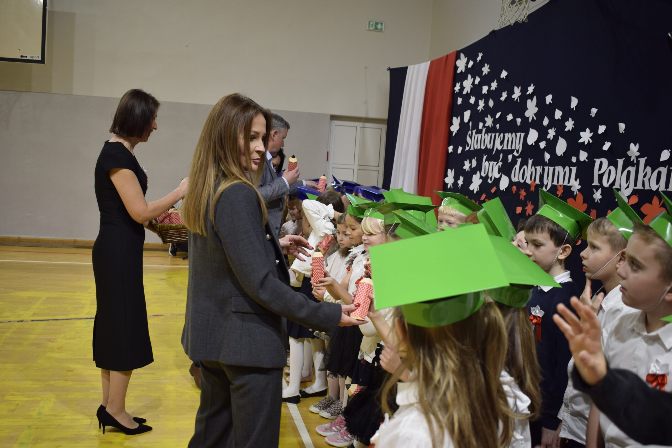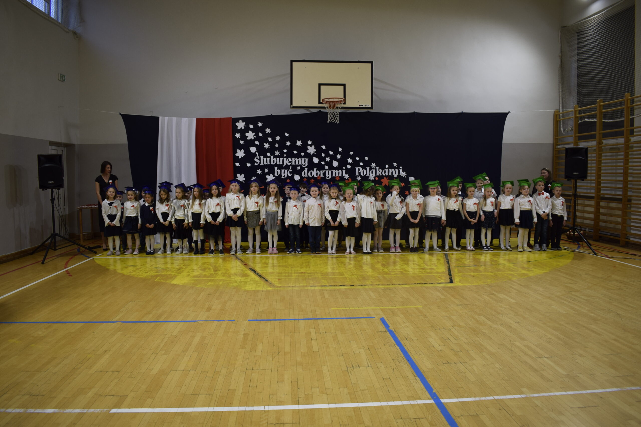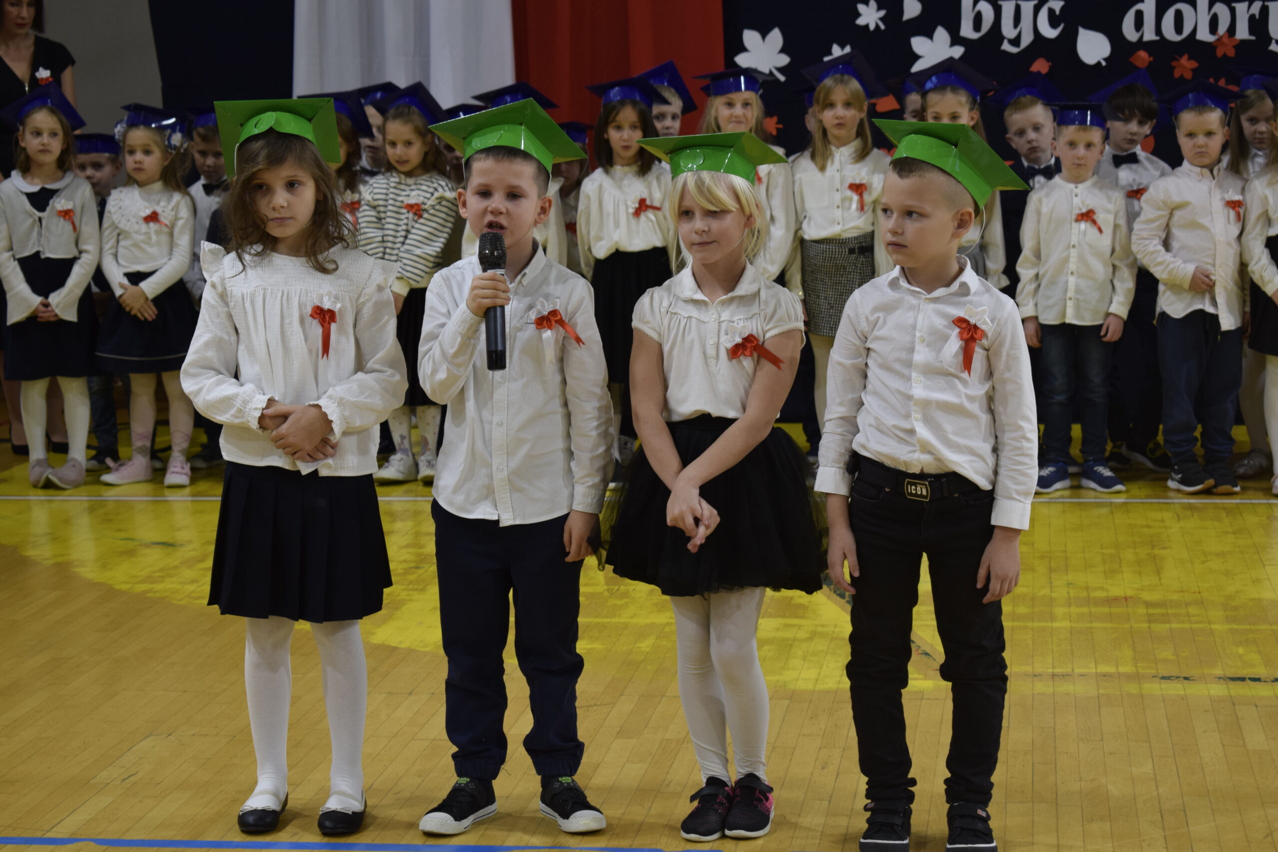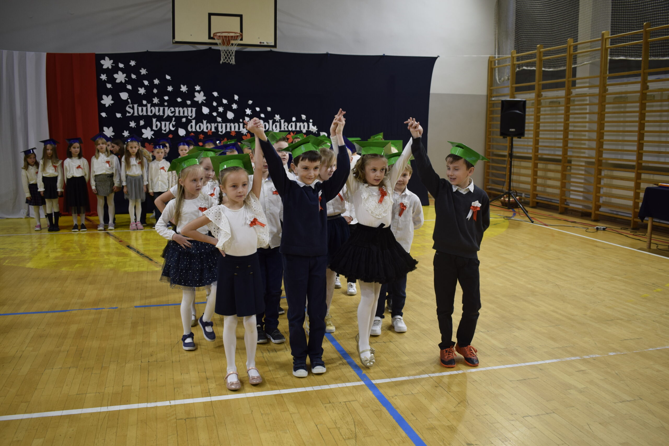 Bohaterowie uroczystości, ubrani w kolorowe birety na początku odtańczyli tradycyjnego poloneza, a następnie przedstawili program artystyczny, w którym zaprezentowali swoje umiejętności recytatorskie i wokalne. Na koniec dzieci wypowiedziały słowa przysięgi, wyrażając gotowość do bycia odpowiedzialnym uczniem, dbania o dobre imię szkoły oraz respektowania jej tradycji. Po uroczystym ślubowaniu, każdy z uczniów został pasowany przez Panią dyrektor Małgorzatę Balicką oraz Panią wiceprezydent Katarzynę Kalinowską na pełnoprawnego ucznia szkoły. Symboliczne pasowanie odbyło się przy użyciu dużego ołówka, który dotknął ramienia każdego dziecka.