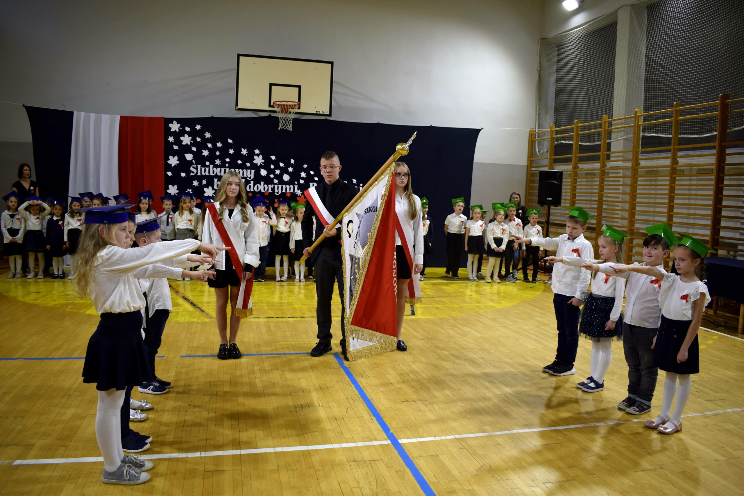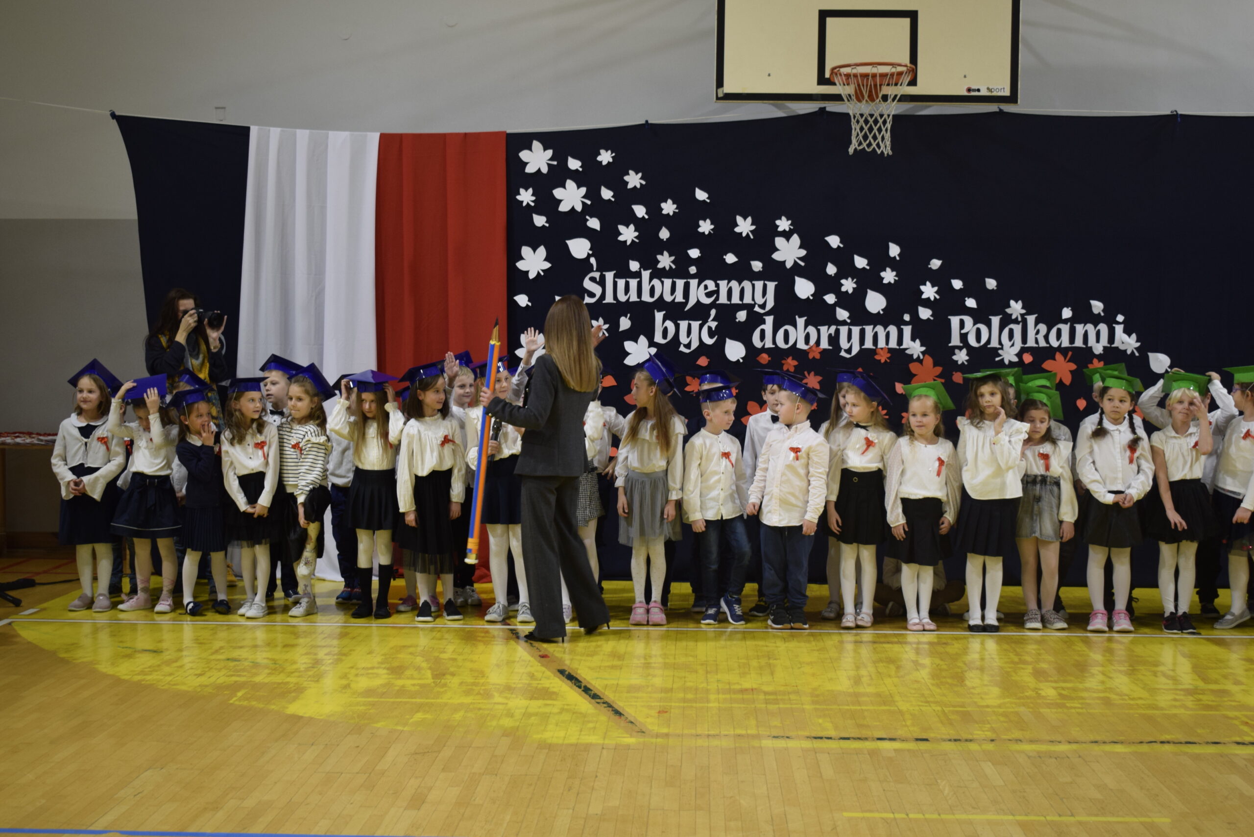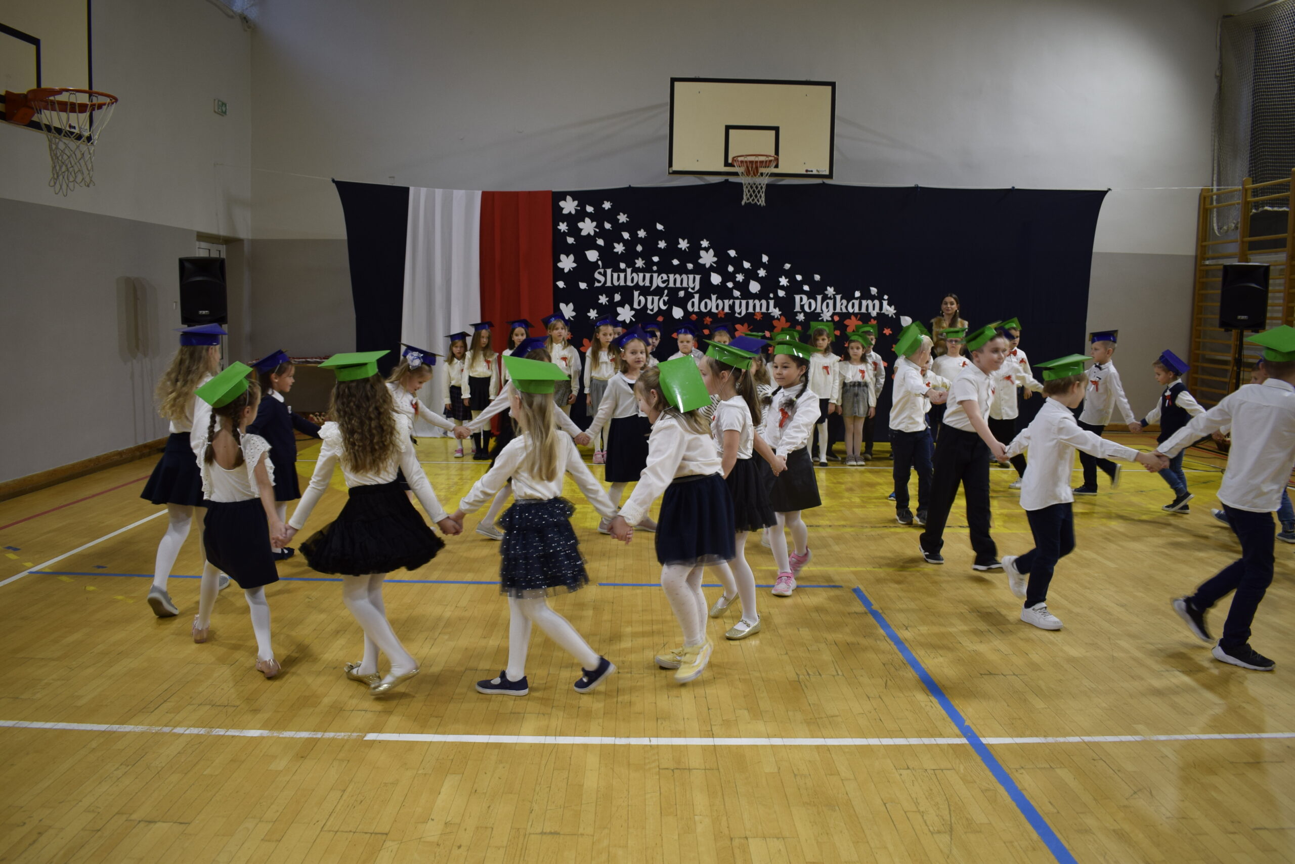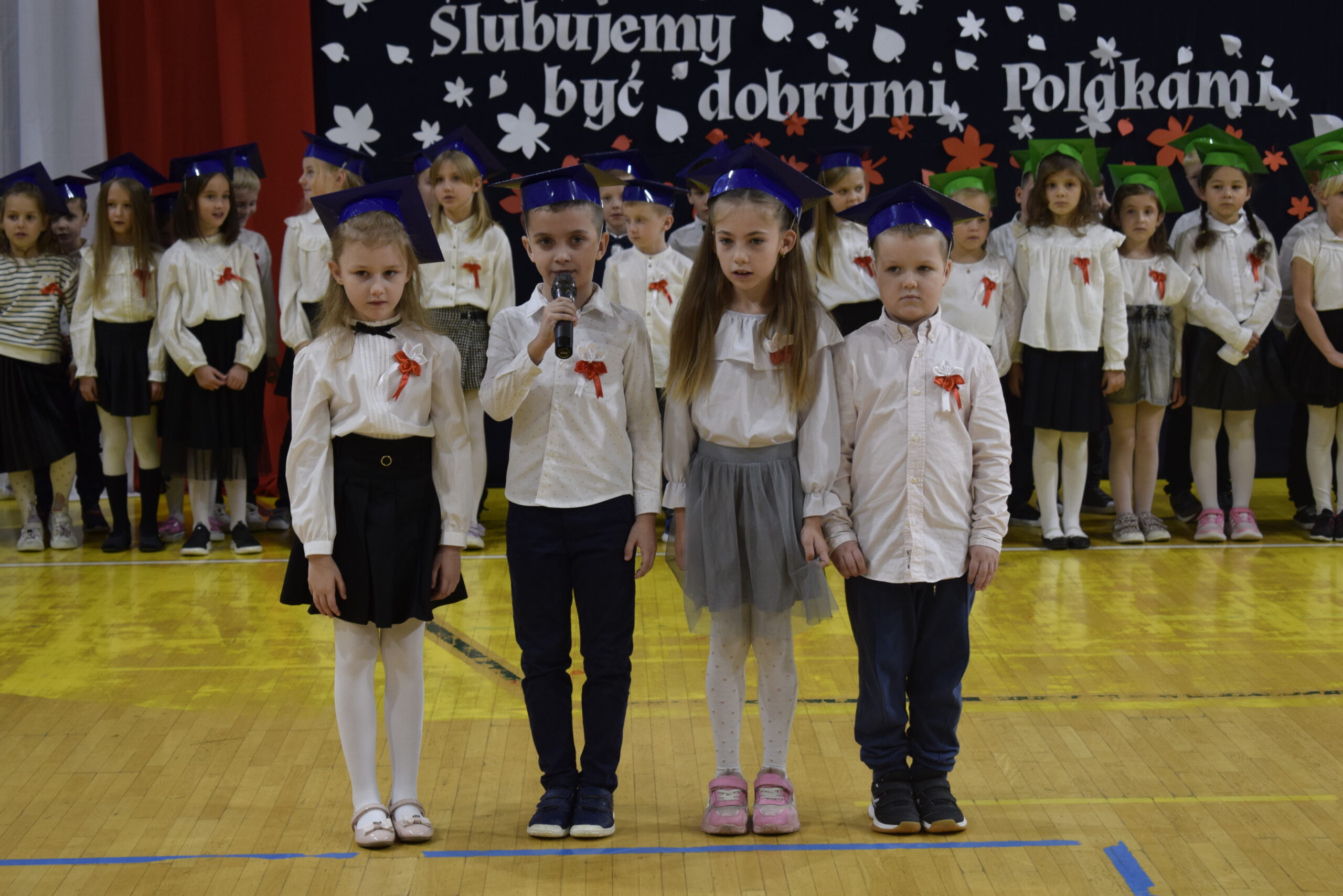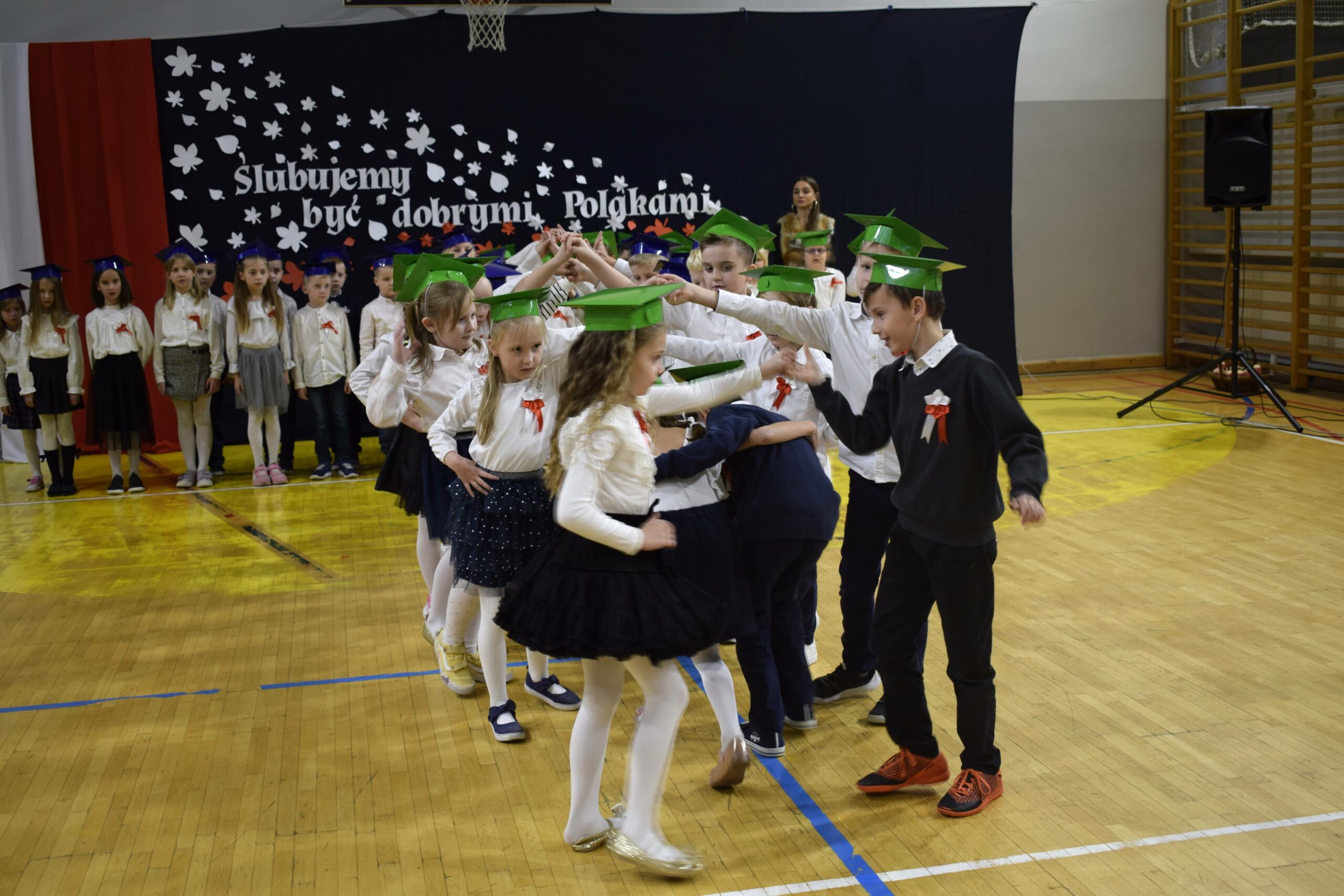Bohaterowie uroczystości, ubrani w kolorowe birety na początku odtańczyli tradycyjnego poloneza, a następnie przedstawili program artystyczny, w którym zaprezentowali swoje umiejętności recytatorskie i wokalne. Na koniec dzieci wypowiedziały słowa przysięgi, wyrażając gotowość do bycia odpowiedzialnym uczniem, dbania o dobre imię szkoły oraz respektowania jej tradycji. Po uroczystym ślubowaniu, każdy z uczniów został pasowany przez Panią dyrektor Małgorzatę Balicką oraz Panią wiceprezydent Katarzynę Kalinowską na pełnoprawnego ucznia szkoły. Symboliczne pasowanie odbyło się przy użyciu dużego ołówka, który dotknął ramienia każdego dziecka.