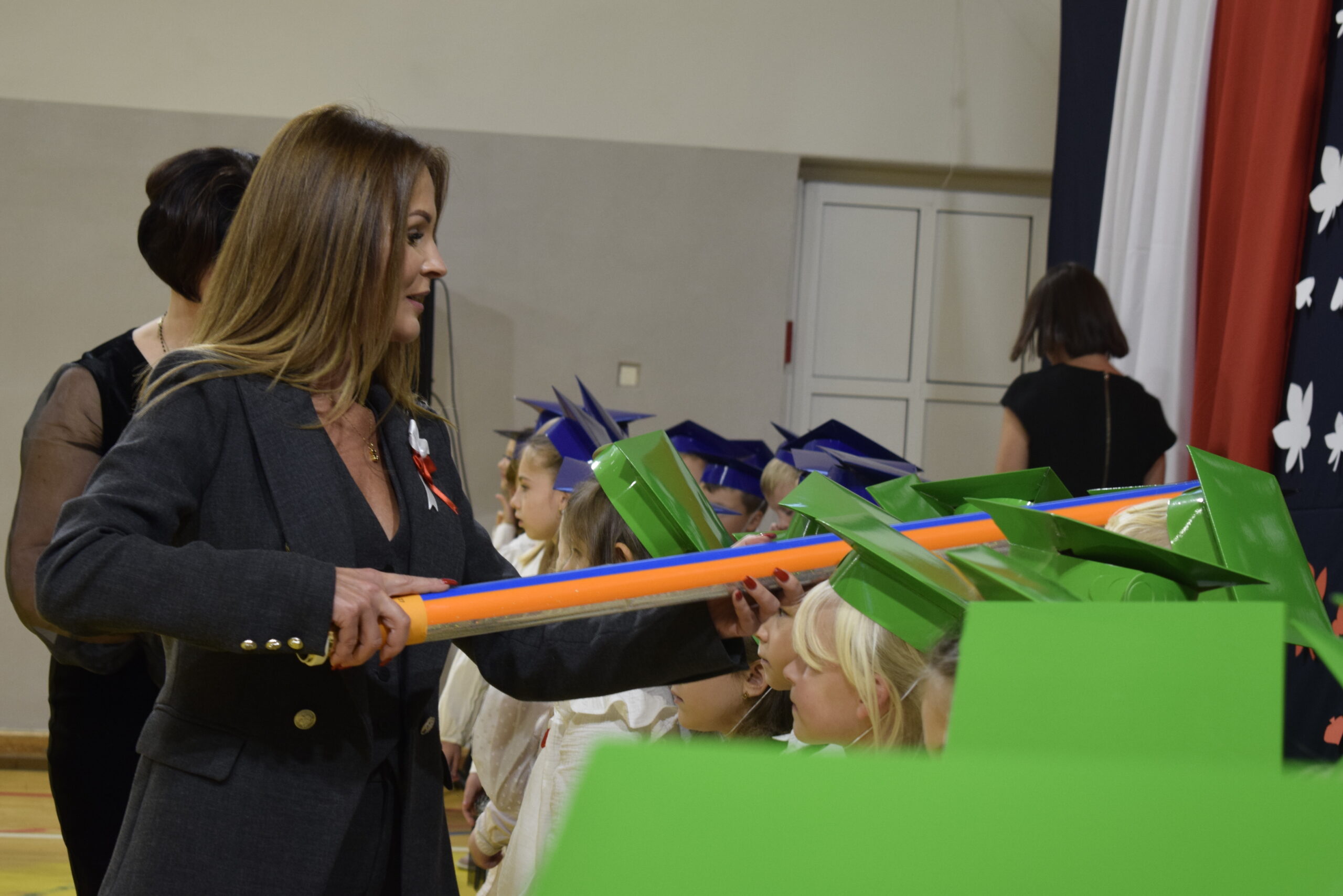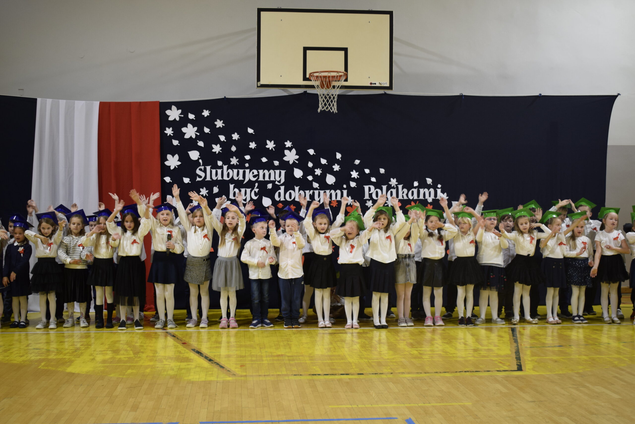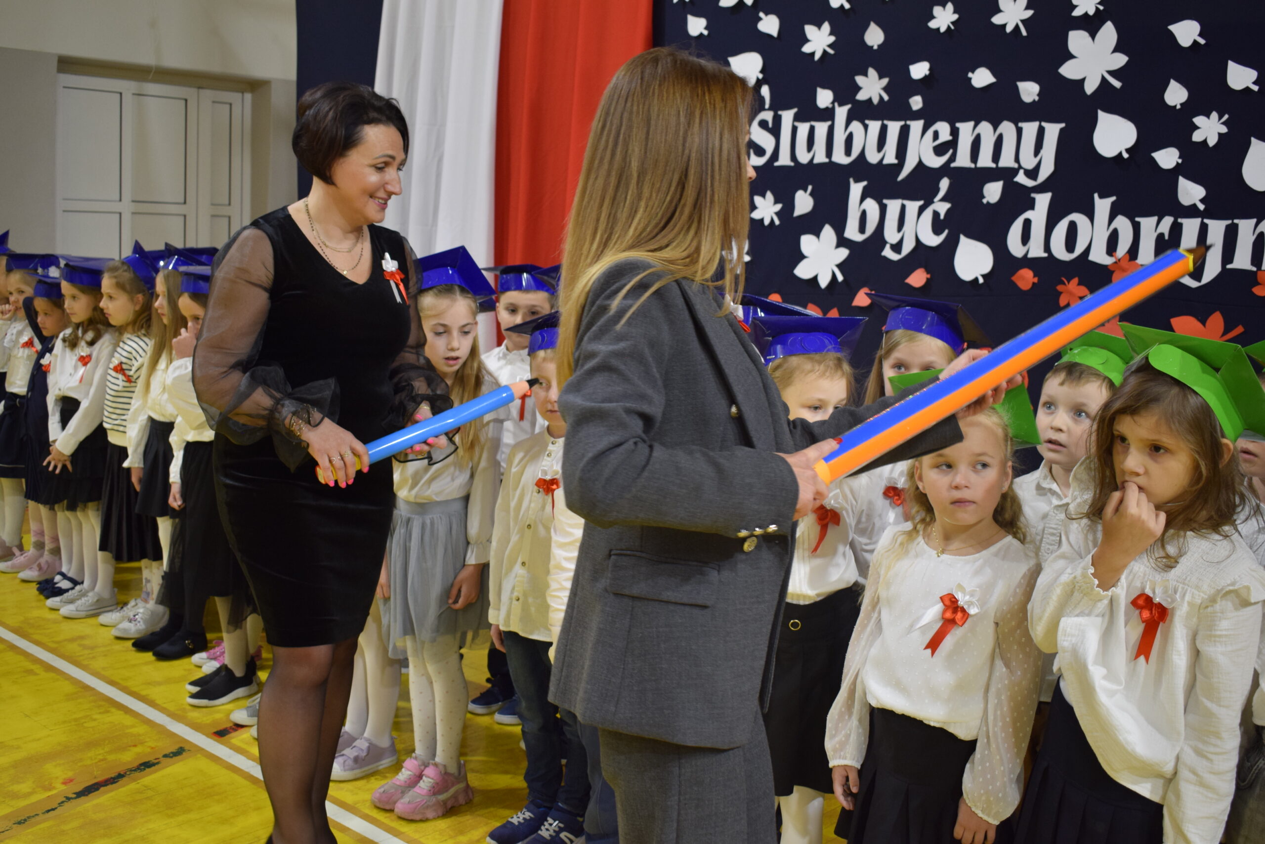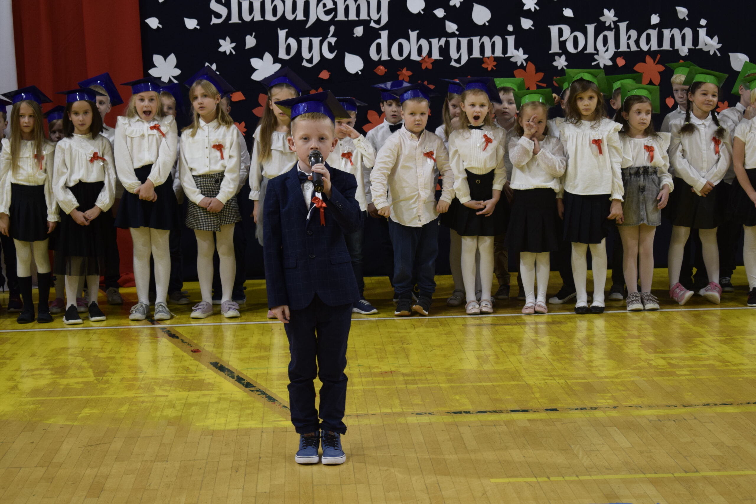 Bohaterowie uroczystości, ubrani w kolorowe birety na początku odtańczyli tradycyjnego poloneza, a następnie przedstawili program artystyczny, w którym zaprezentowali swoje umiejętności recytatorskie i wokalne. Na koniec dzieci wypowiedziały słowa przysięgi, wyrażając gotowość do bycia odpowiedzialnym uczniem, dbania o dobre imię szkoły oraz respektowania jej tradycji. Po uroczystym ślubowaniu, każdy z uczniów został pasowany przez Panią dyrektor Małgorzatę Balicką oraz Panią wiceprezydent Katarzynę Kalinowską na pełnoprawnego ucznia szkoły. Symboliczne pasowanie odbyło się przy użyciu dużego ołówka, który dotknął ramienia każdego dziecka.