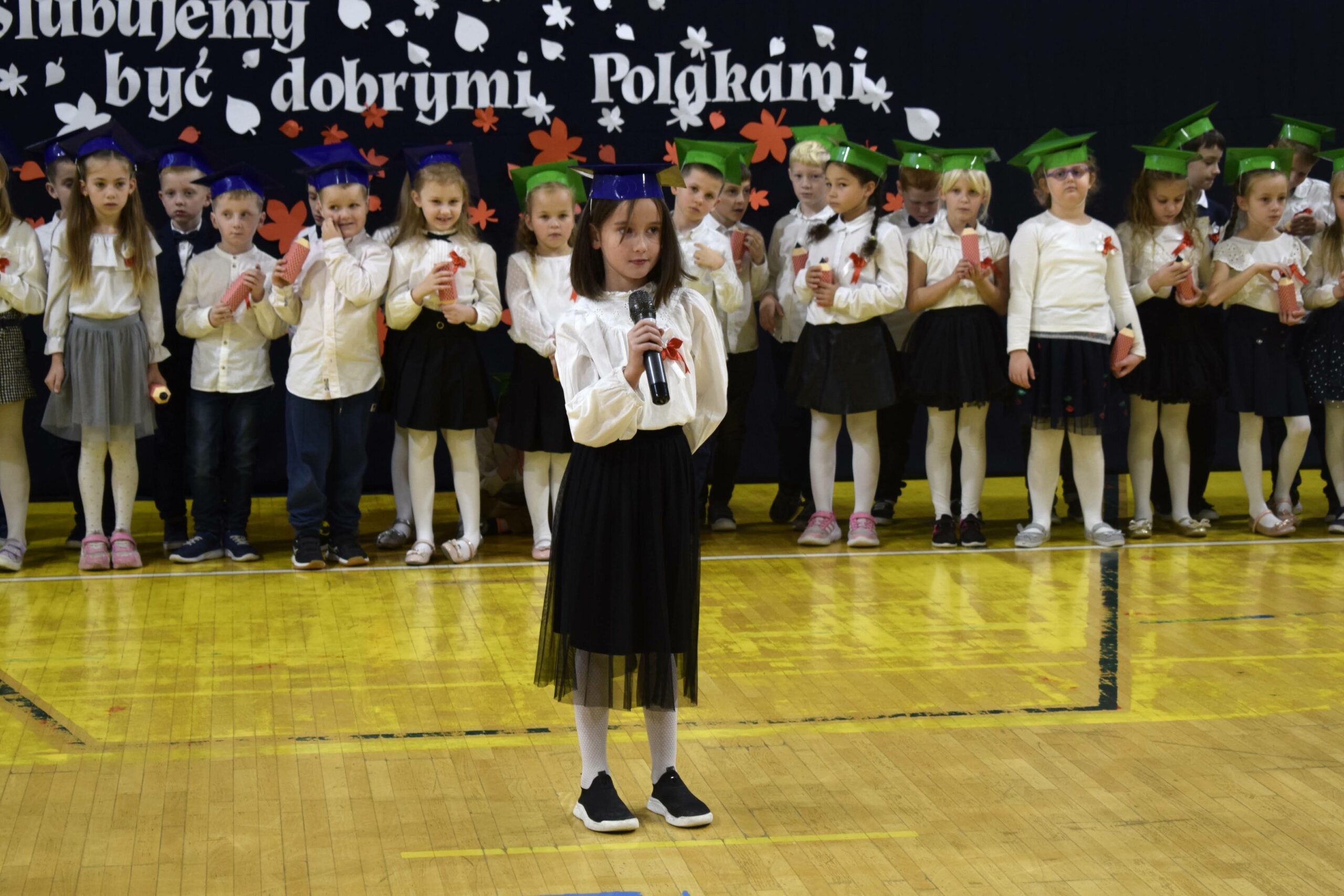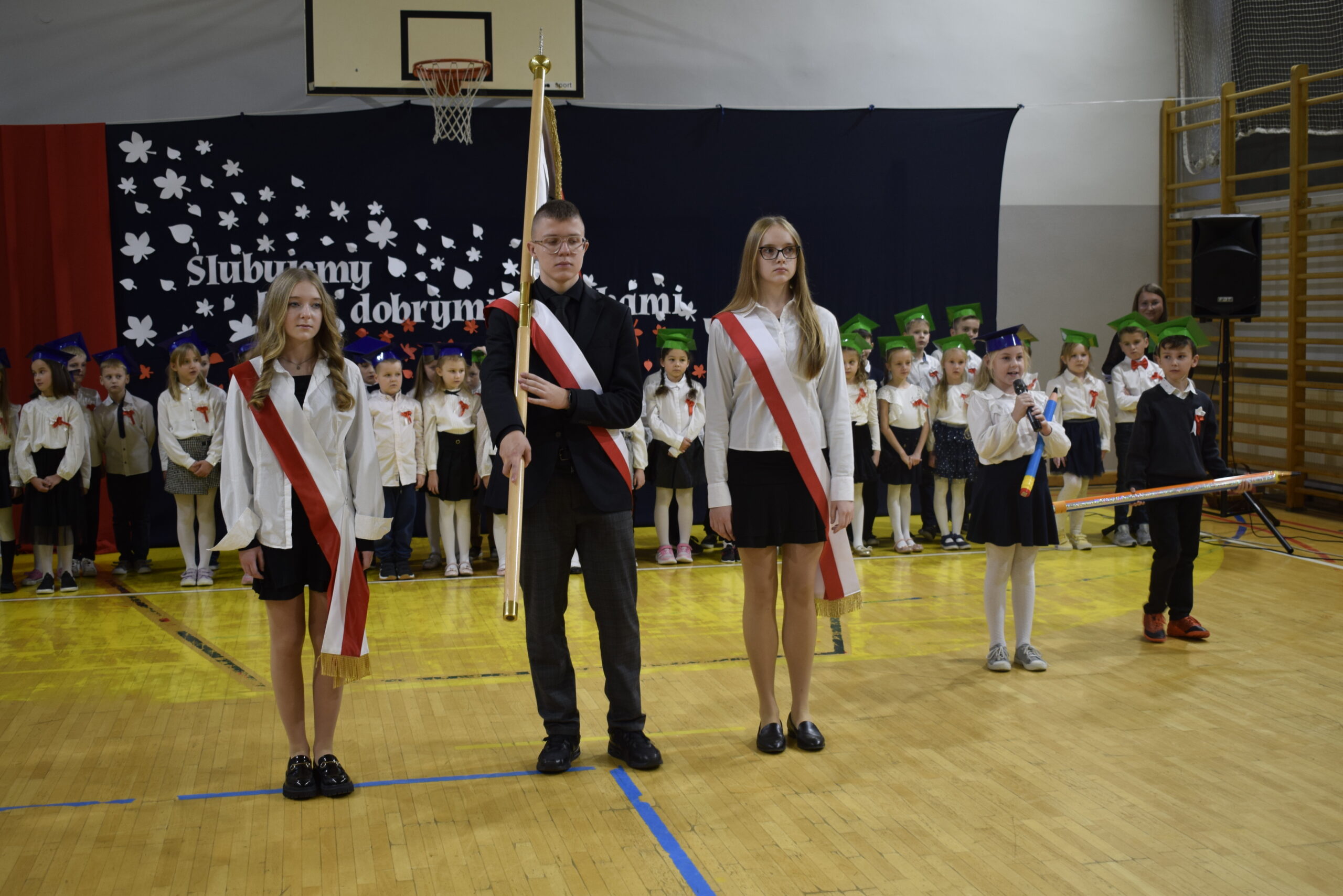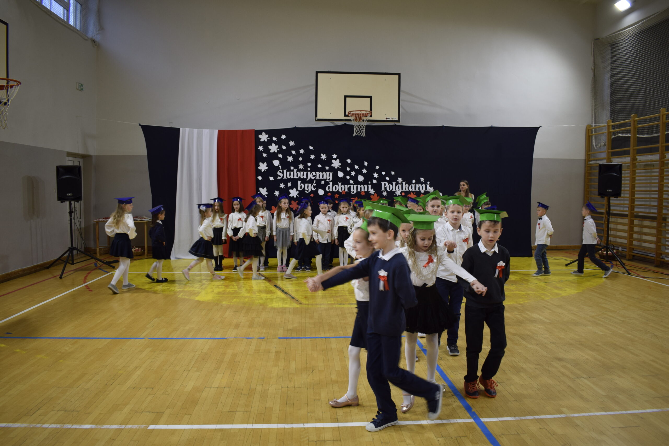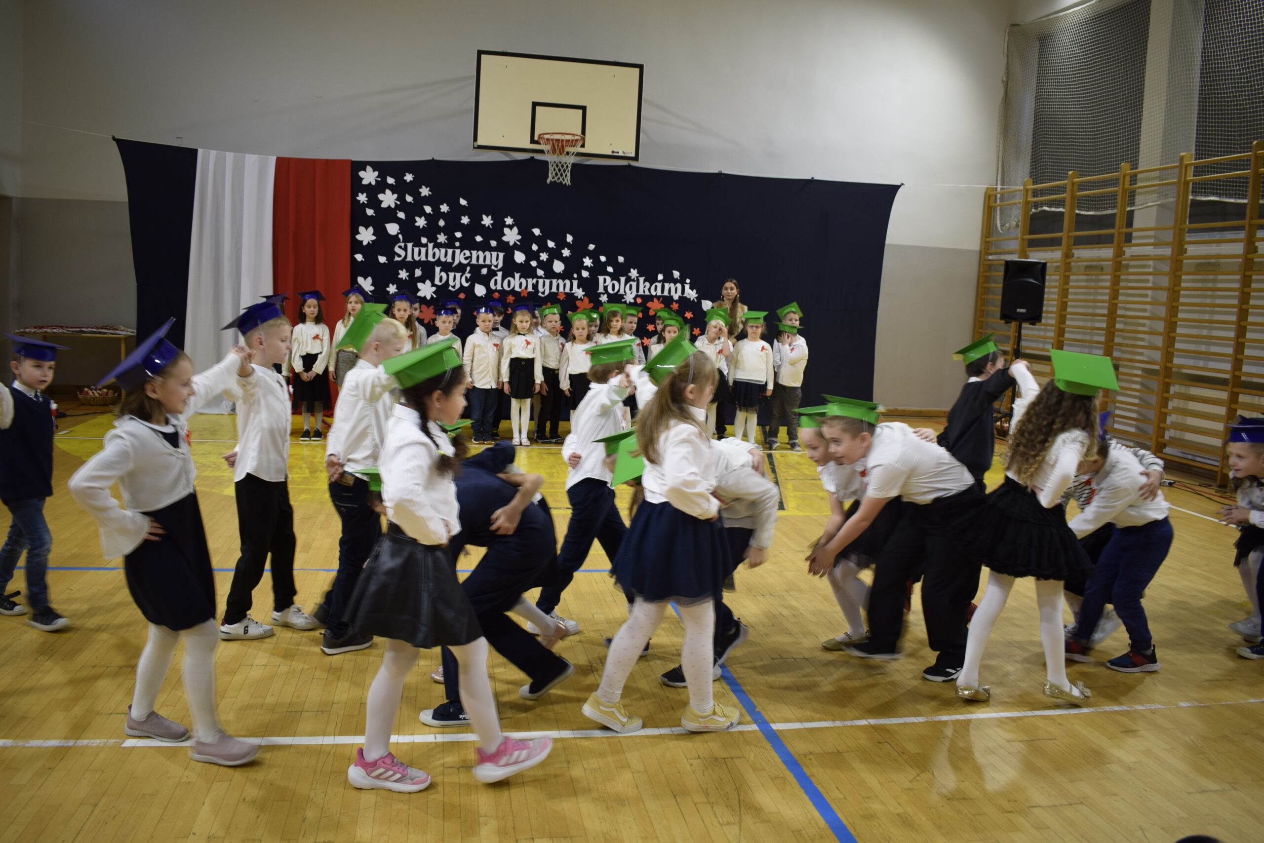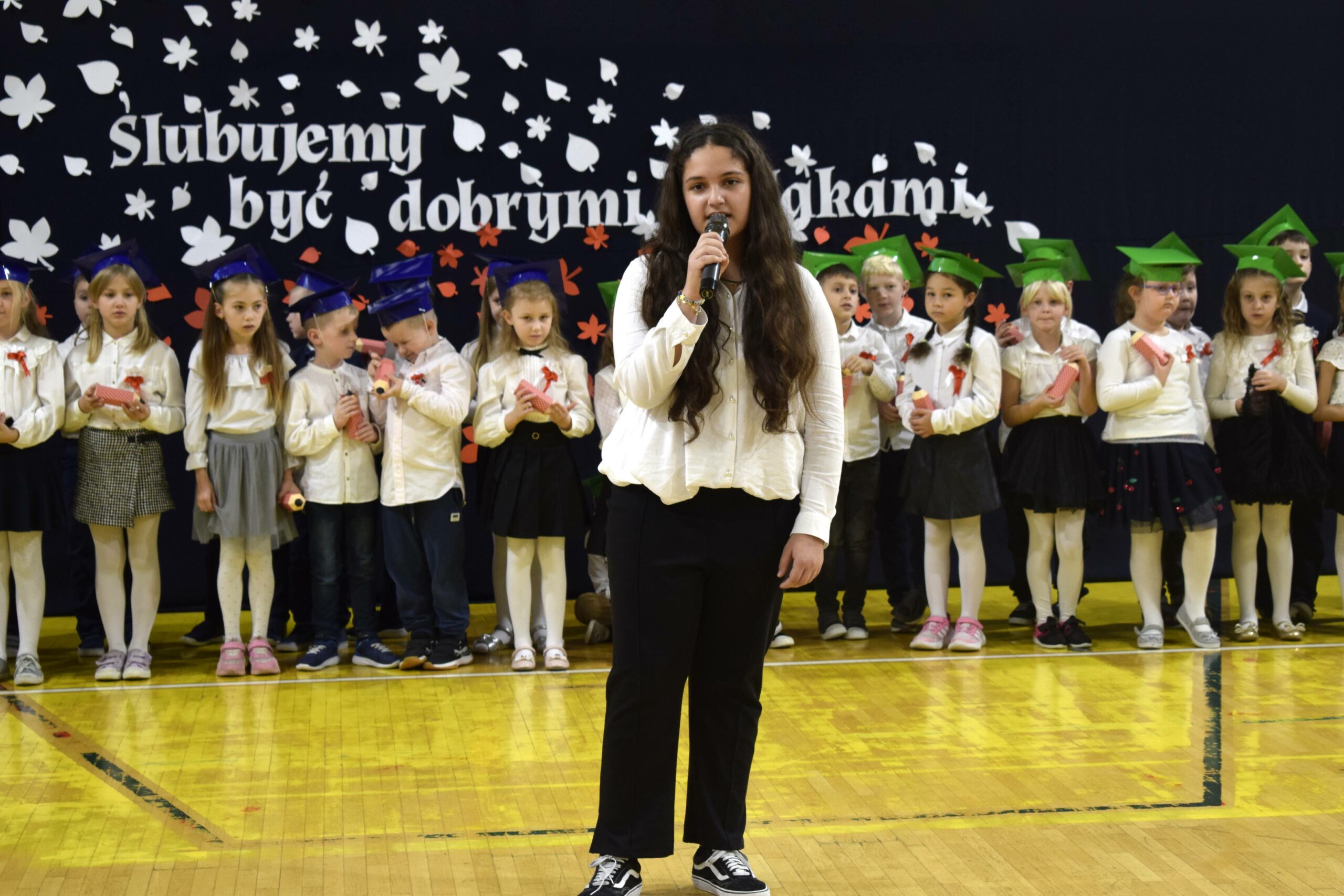 Bohaterowie uroczystości, ubrani w kolorowe birety na początku odtańczyli tradycyjnego poloneza, a następnie przedstawili program artystyczny, w którym zaprezentowali swoje umiejętności recytatorskie i wokalne. Na koniec dzieci wypowiedziały słowa przysięgi, wyrażając gotowość do bycia odpowiedzialnym uczniem, dbania o dobre imię szkoły oraz respektowania jej tradycji. Po uroczystym ślubowaniu, każdy z uczniów został pasowany przez Panią dyrektor Małgorzatę Balicką oraz Panią wiceprezydent Katarzynę Kalinowską na pełnoprawnego ucznia szkoły. Symboliczne pasowanie odbyło się przy użyciu dużego ołówka, który dotknął ramienia każdego dziecka.