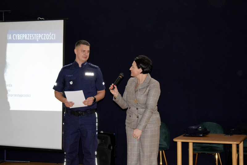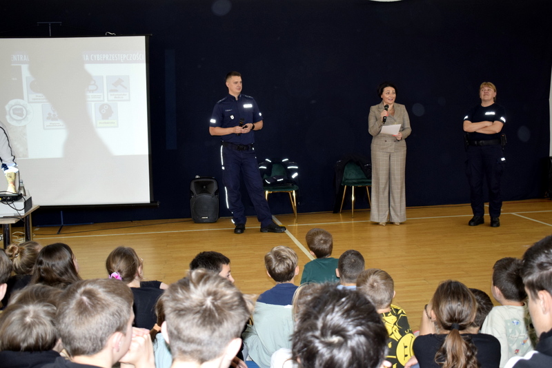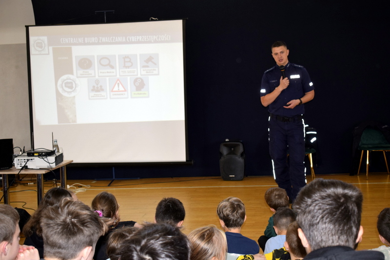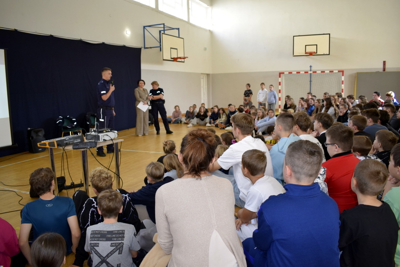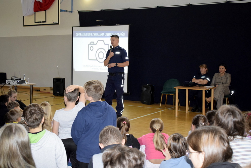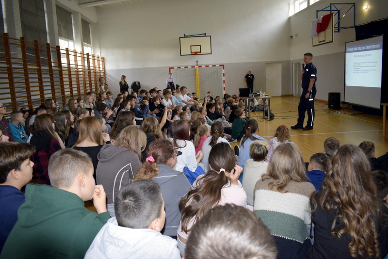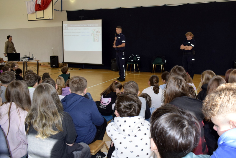 W ramach Tygodnia odbyły się także niezwykle wartościowe dwa spotkania profilaktyczne wszystkich uczniów z Policją. Naszym gościem był mł.asp. Kamil Warda z Centralnego Biura Zwalczania Cyberprzestępczości w Radomiu oraz pani dzielnicowa mł.asp. Katarzyna Cielecka. Nasz gość zapoznał bardzo rzetelnie młodszych i starszych uczniów z tematem negatywnych skutków korzystania ze smartfonów, przemocy rówieśniczej, hejtu, cyberbezpieczeństwa, bezpieczeństwa w szkole i poza nią oraz reagowaniu na nieznajomych.