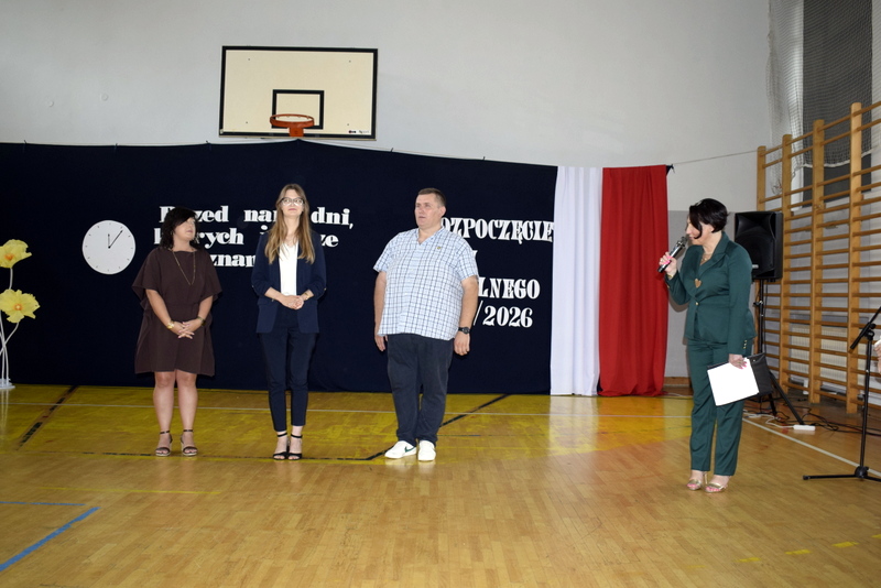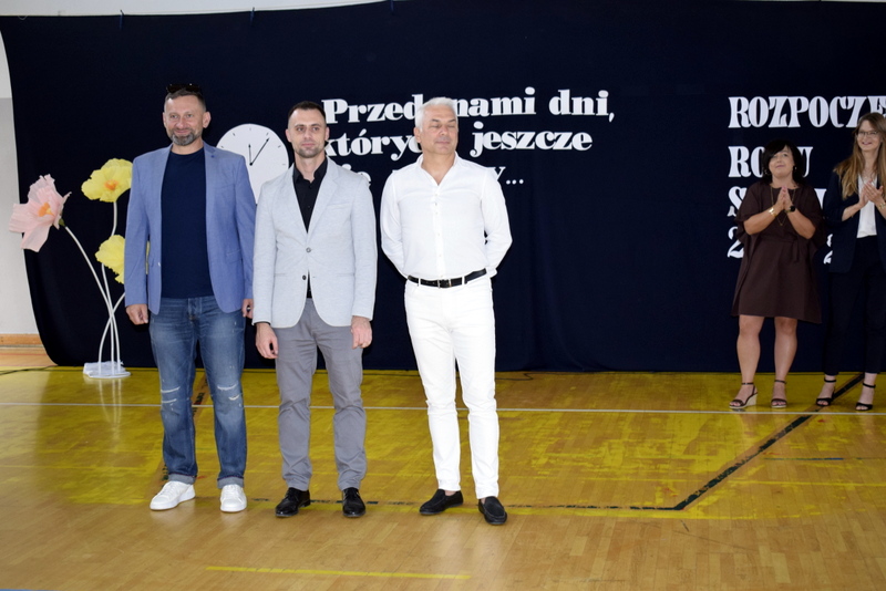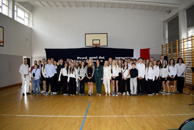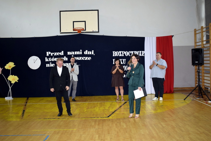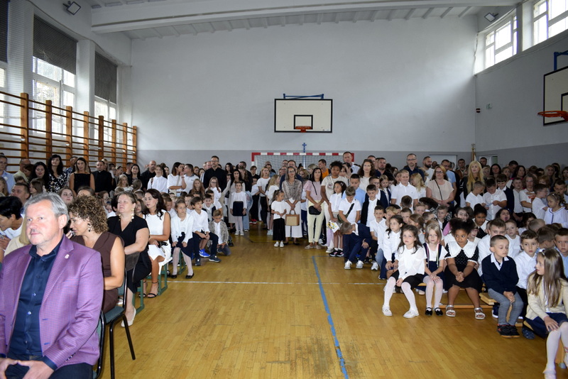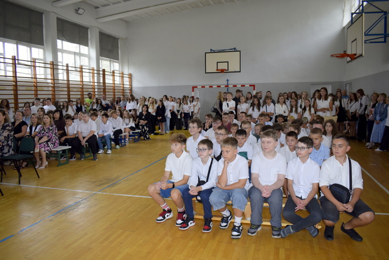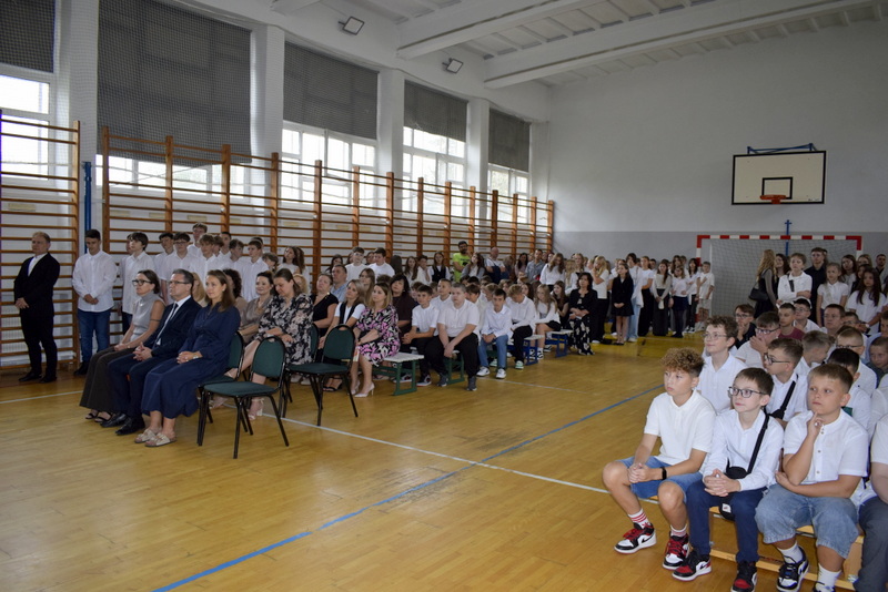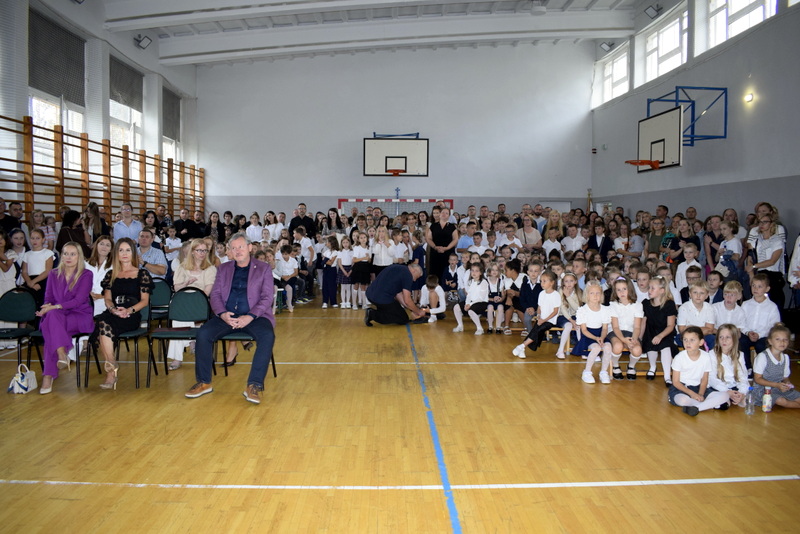 Na sali gimnastycznej spotkali się uczniowie naszej szkoły wraz z nauczycielami i przejętymi rodzicami. Swoją obecnością zaszczycili nas także goście specjalni: Pani Wiceprezydent Radomia Katarzyna Kalinowska oraz Radny Pan Piotr Szprendałowicz.