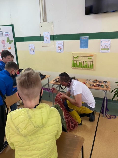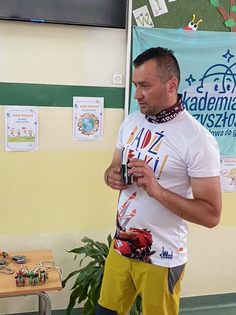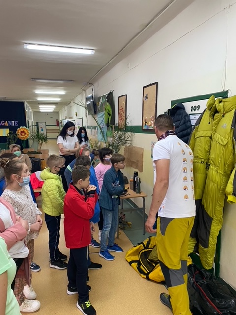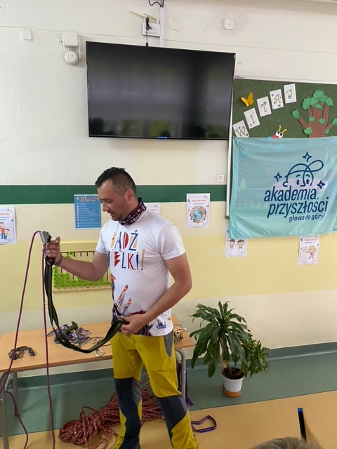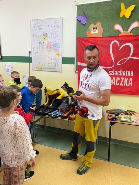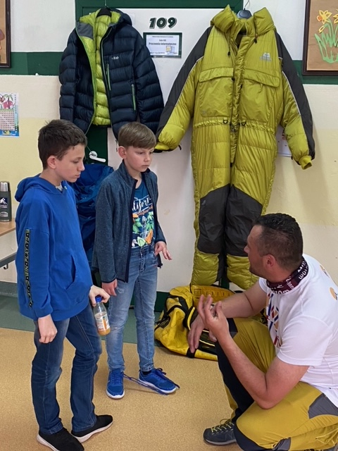 Uczniowie mieli okazję poznać jak wygląda sprzęt alpinistyczny, w czym chodzi się po górach, przy pomocy jakich narzędzi można się wspinać, jak przygotować sobie miejsce do spania, jak bezpiecznie przemieszczać się w górach wysokich, jak wygląda dieta alpinisty, himalaisty, co się je podczas wypraw, jak trzeba się wspierać w górach, jak bezpiecznie zejść ze szczytu i jak ważna jest w tym wszystkim komunikacja oraz budowanie wzajemnych relacji opartych na prawdzie, szacunku i zaufaniu.