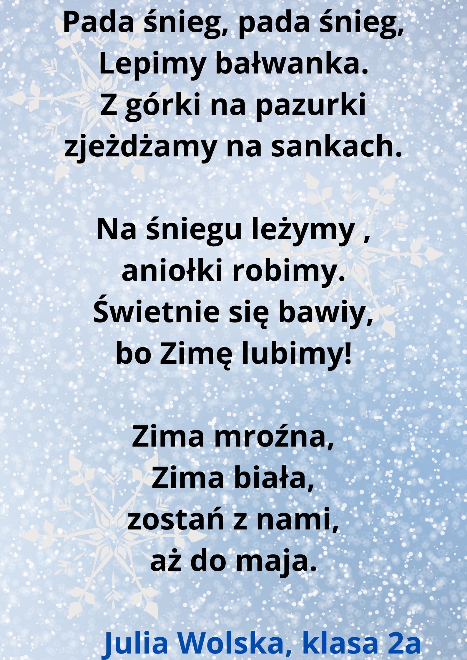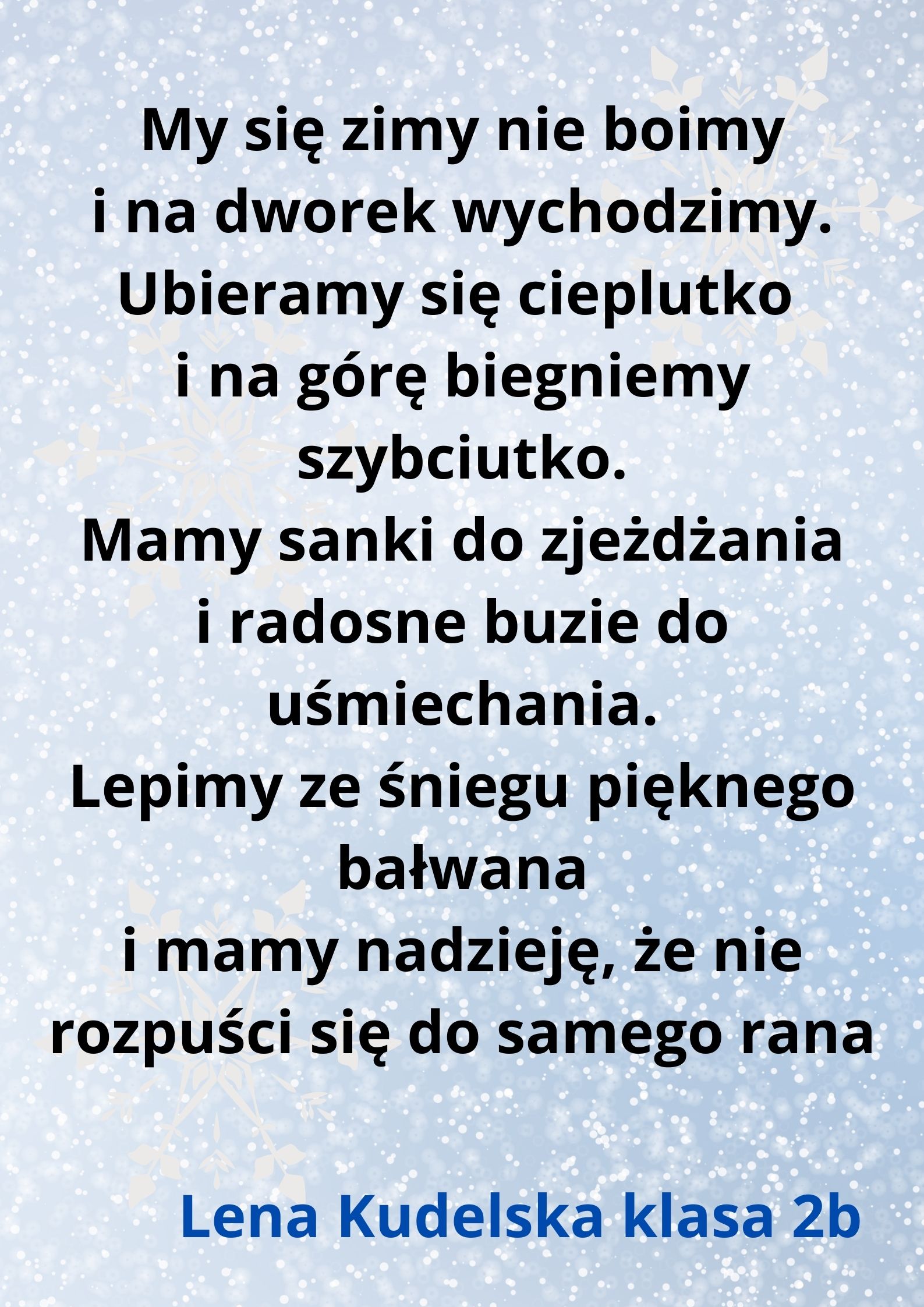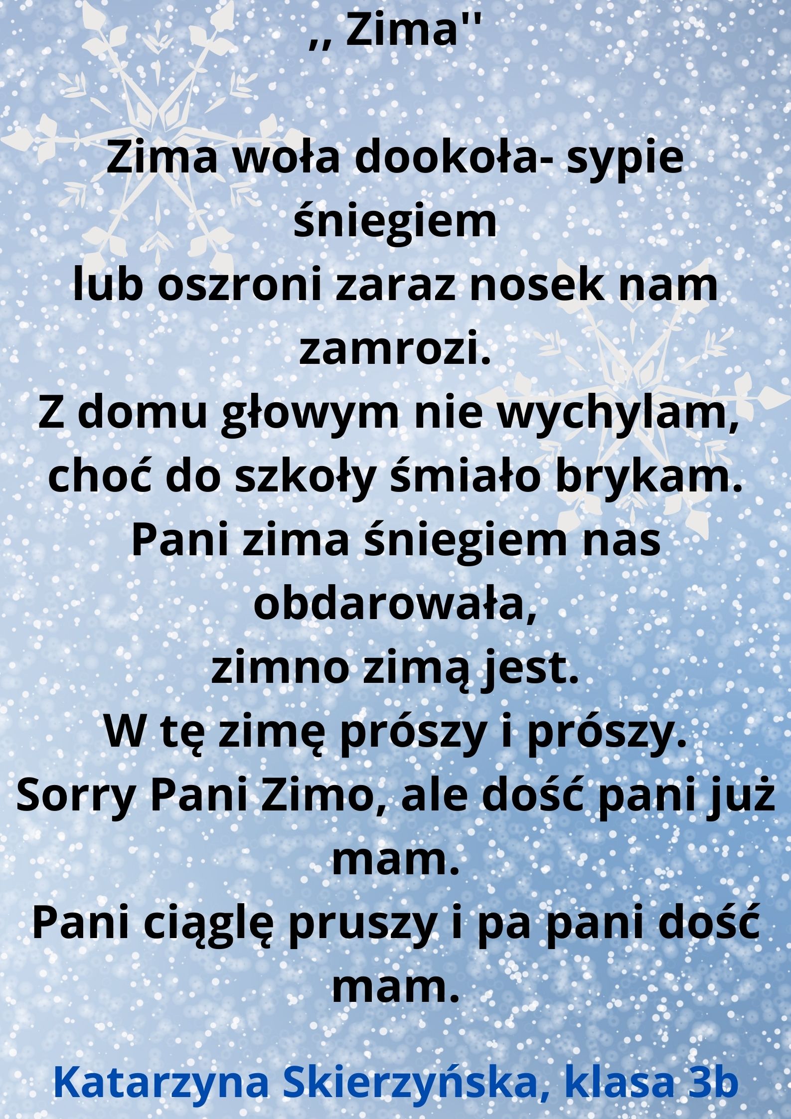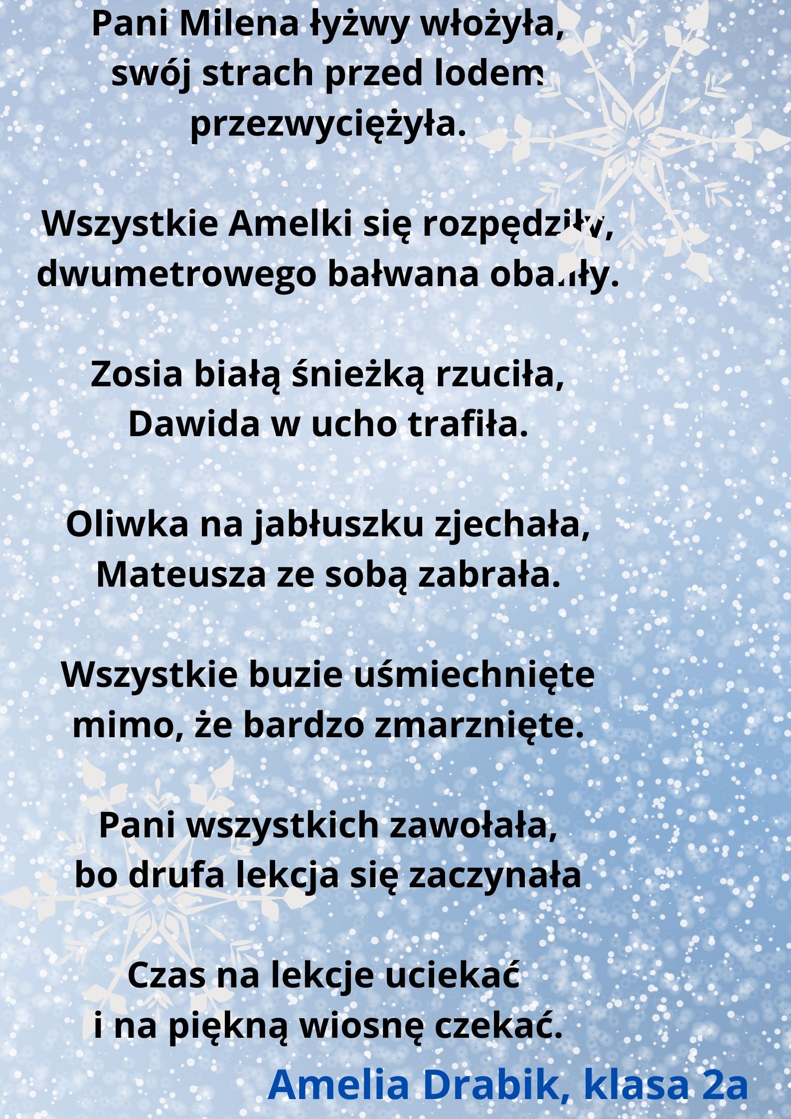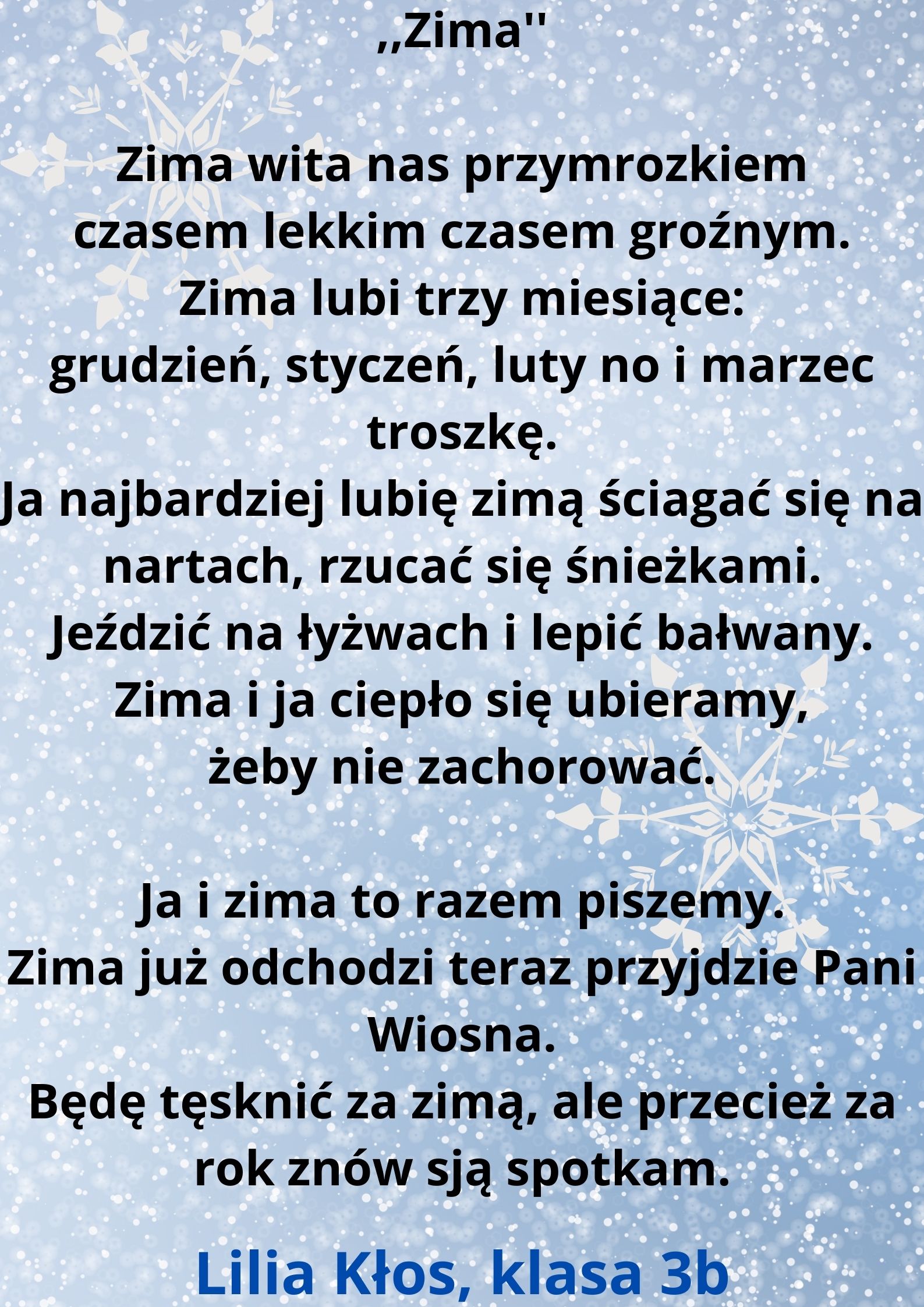 Zima powolutku ucieka od nas, aby ugościć Panią Wiosnę. Na zakończenie mroźnej pory roku powstały przepiękne zimowe rymowanki. Serdecznie gratulujemy zwycięzcom konkursu „Zimowe rymowanki” i czekamy na kolejne, wspaniałe wiersze.