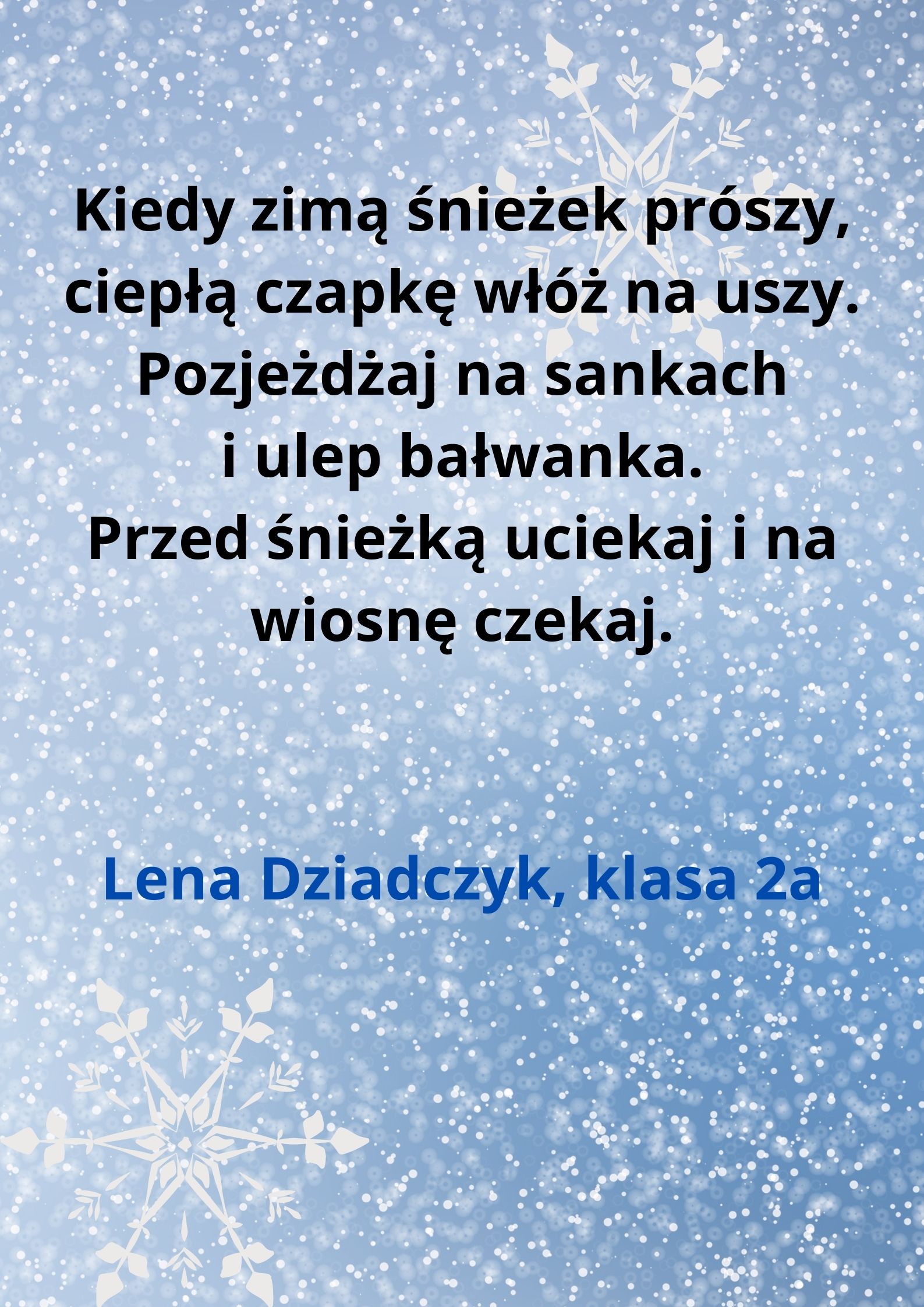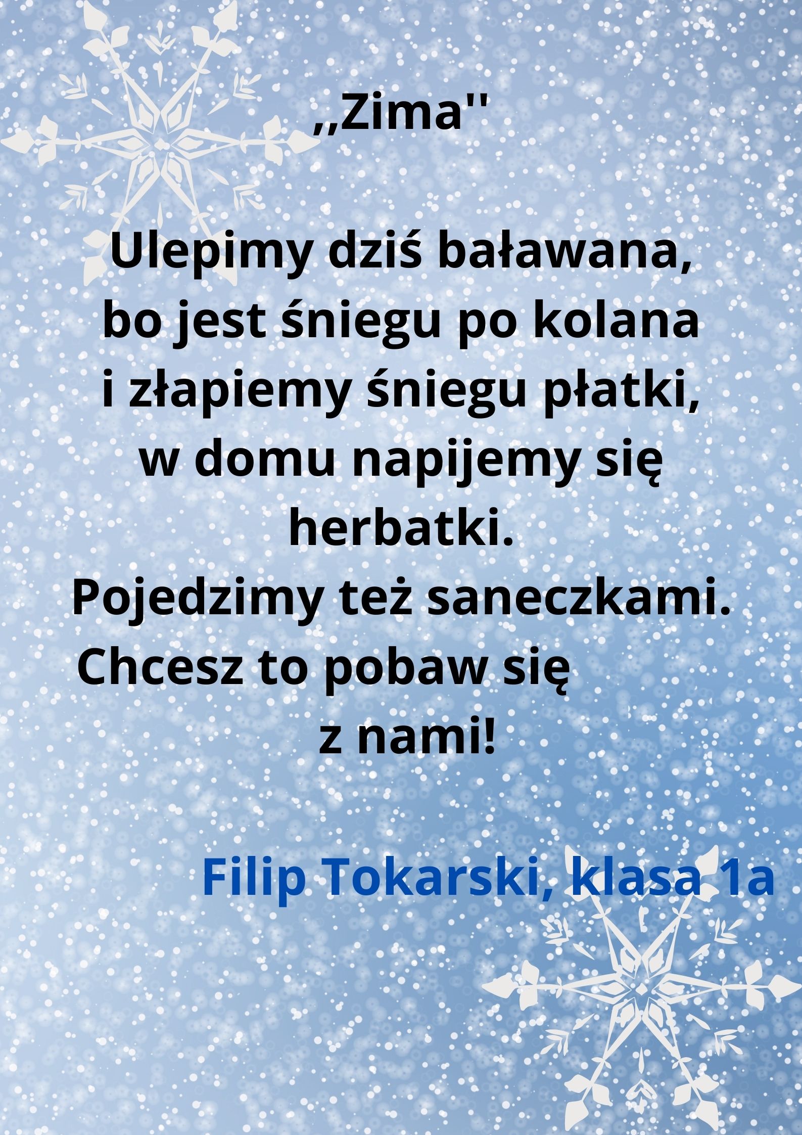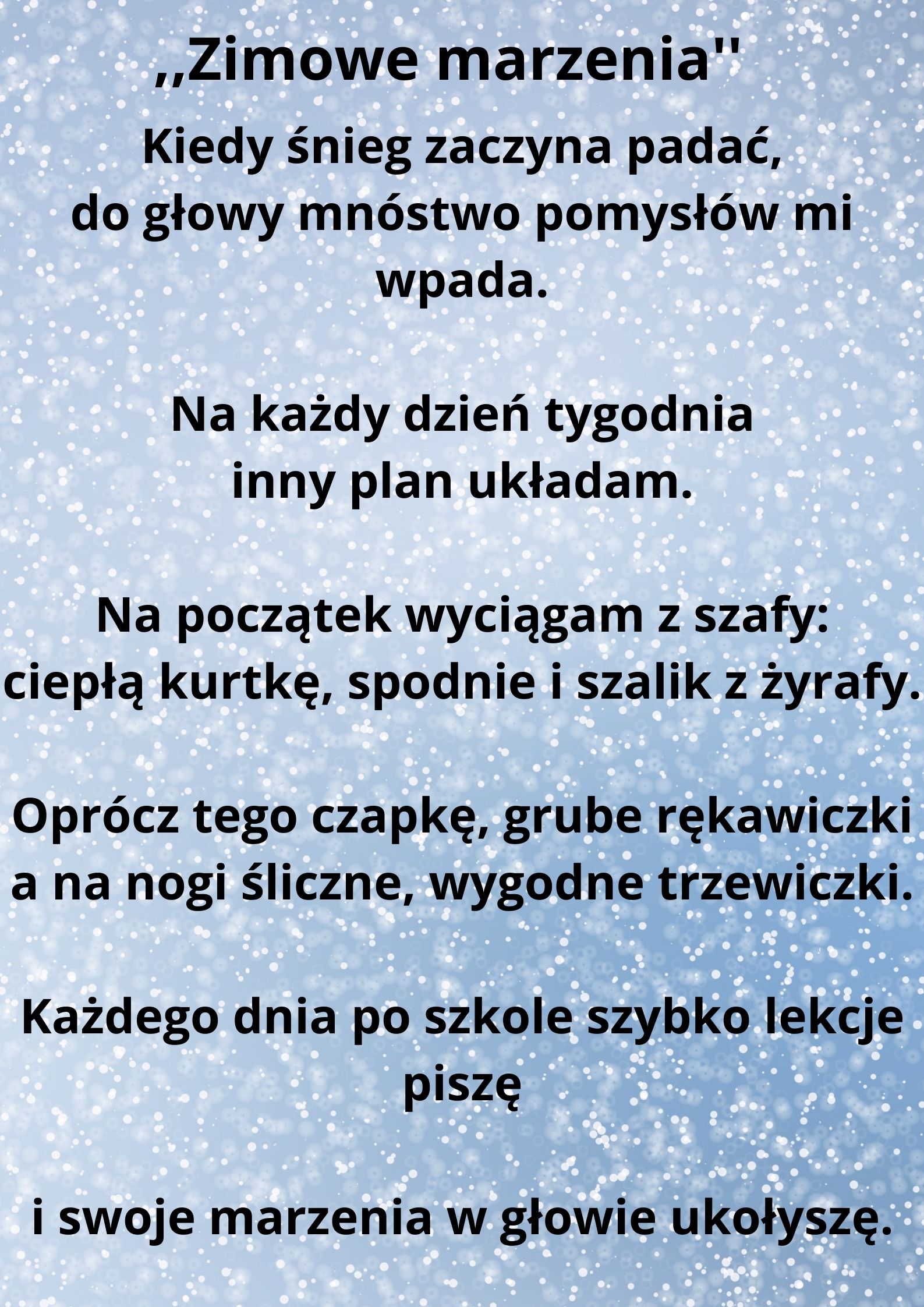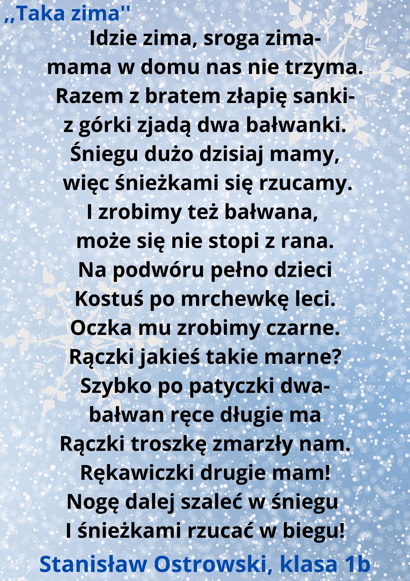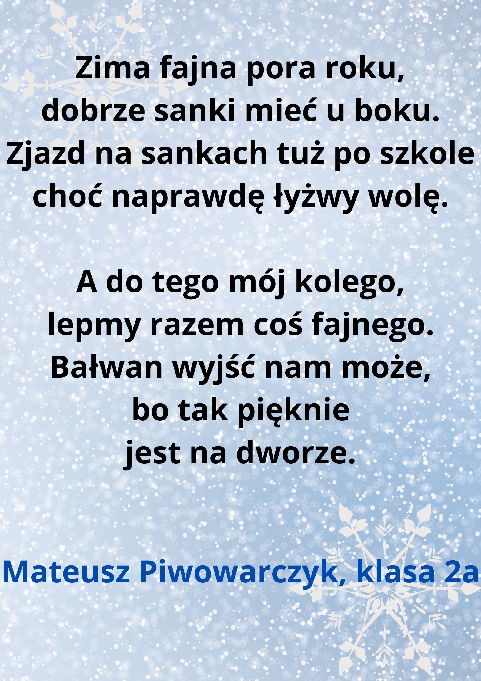 Zima powolutku ucieka od nas, aby ugościć Panią Wiosnę. Na zakończenie mroźnej pory roku powstały przepiękne zimowe rymowanki. Serdecznie gratulujemy zwycięzcom konkursu „Zimowe rymowanki” i czekamy na kolejne, wspaniałe wiersze.