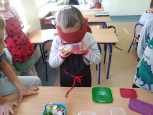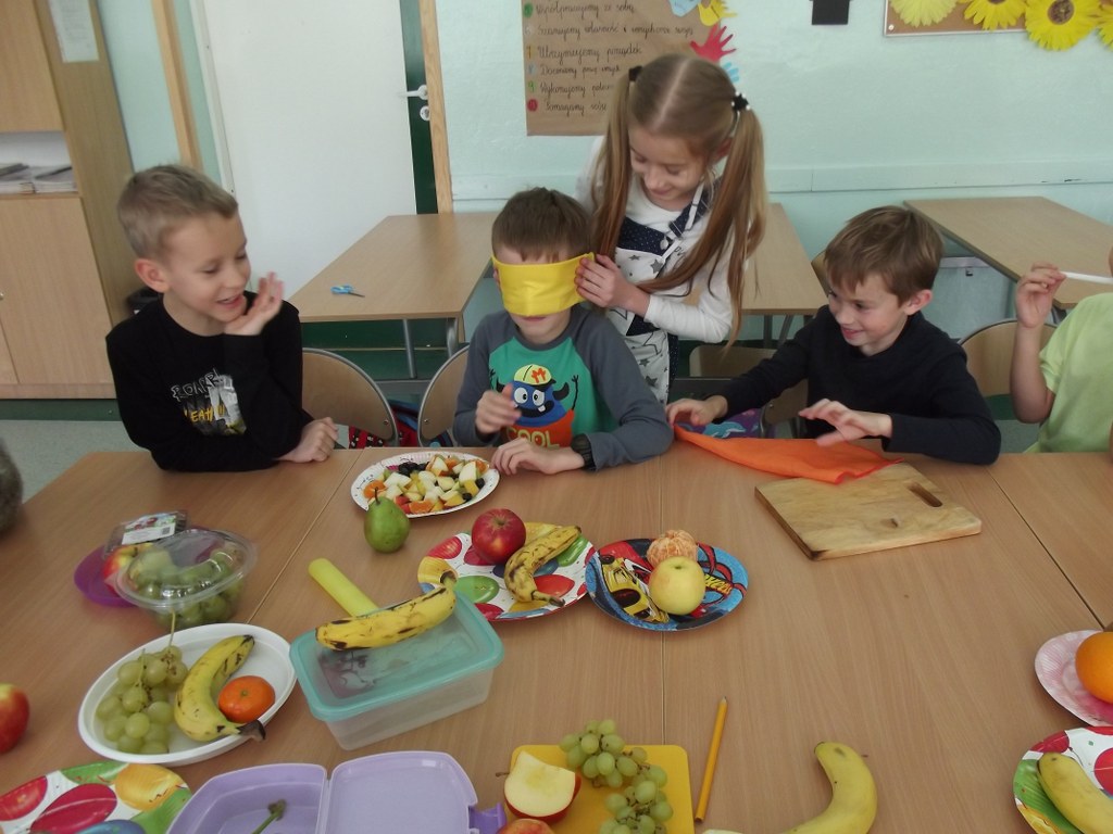 W październiku uczniowie klas I, II i III realizowali temat „Jemy zdrowo i kolorowo” w ramach programów „ Moje zdrowie, moja siła, wielka moc” oraz „ Zdrowo jem, więcej wiem”. Jedną z części zajęć było zrobienie zdrowych i kolorowych kanapek. Dzieci przyniosły do szkoły potrzebne produkty i w grupach przygotowywały smaczne, pełne witamin kanapki. Praca przyniosła wszystkim wiele radości. Dzieci przekonały się, że najlepiej smakują kanapki wykonane własnoręcznie. Uczniowie przygotowali również owocowe szaszłyki i sałatki. Zapoznawali się z zapachami i kształtami warzyw i owoców. Wszyscy wiedzą, jakie korzyści wynikają ze spożywania zdrowego, drugiego śniadania. Zajęcia były “bardzo smaczne”.