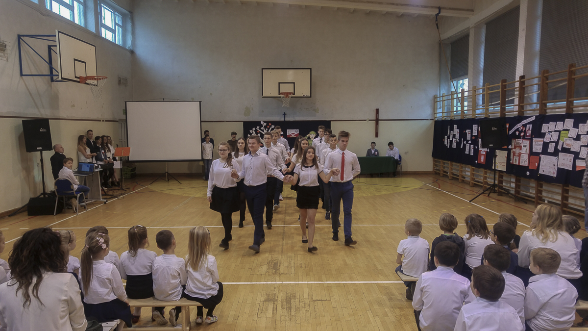 Uwieńczeniem podjętych działań był przemarsz społeczności szkolnej ulicami osiedla pod Dąbek Katyński znajdujący się na terenie naszej szkoły – posadzony w 2010 roku, poświęcony pamięci radomianina Kazimierza Kaszewskiego zamordowanego w Katyniu w 1940 r. Na czele pochodu szły oddziały przedszkolne z pięknie wyeksponowanymi, samodzielnie wykonanymi kotylionami, za nimi uczniowie klasy pierwszej i czwartej, dalej kolejno drugie i trzecie klasy gimnazjum.