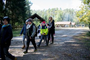 Tradycją szkoły już od wielu lat są rajdy integracyjne, które mają integrować społeczność szkolną uczniów, nauczycieli i rodziców, promować alternatywne sposoby spędzania czasu wolnego. Zazwyczaj rajdy odbywały się pod koniec września, gdyż właśnie wtedy obchodzimy Światowy Dzień Turystyki. W tym roku zaplanowaliśmy nasz rajd na 3 października pod hasłem BIAŁO-CZERWONE WĘDROWANIE, ponieważ chcieliśmy w ten sposób uczcić 100 – lecie odzyskania niepodległości. Miejscem docelowym miała być Garbatka Letnisko i wieś Molendy, gdzie znajduje się cmentarz z okresu I wojny światowej. Niestety pogoda spłatała nam figla. Ulewny deszcz przestraszył wszystkich. Mimo to podjęliśmy decyzję… jedziemy. Razem z przewodnikiem radomskiego oddziału PTTK panem Karolem Walczakiem podjęliśmy decyzję o zmianie trasy na Królewskie Źródła, gdzie 4 wiaty mogły ochronić nas od deszczu. Zarówno uczniowie jak i pozostali uczestnicy byli przygotowani na taką pogodę – płaszcze przeciwdeszczowe, parasolki, kalosze spełniły swoje zadanie. Wyruszyliśmy w strugach deszczu. Nim dotarliśmy do leśniczówki deszcz powoli przestał padać, a słońce wyjrzało zza chmur. Piękna pogoda powróciła. Zostaliśmy podzieleni na dwie grupy. Na początku gimnazjaliści z przewodnikiem poszli podziwiać piękno przyrody, a młodsze klasy w tym czasie zajęły się rywalizacją sportową i pieczeniem kiełbasek. Kiedy klasy III wróciły, młodsze dzieci wraz z przewodnikiem udały się leśnymi ścieżkami w poszukiwaniu przygody.