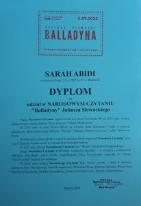 O Narodowym Czytaniu 2020 będą przypominały mi pamiątki otrzymane od Miejskiej Biblioteki Publicznej – okolicznościowa pieczęć w moim egzemplarzu „Balladyny” wraz z autografem pana Dariusza Jakubowskiego, piękna przypinka, dyplom od radomskiego oddziału Towarzystwa Nauczycieli Bibliotekarzy Szkół Polskich oraz wspaniałe wspomnienia i zdjęcia.